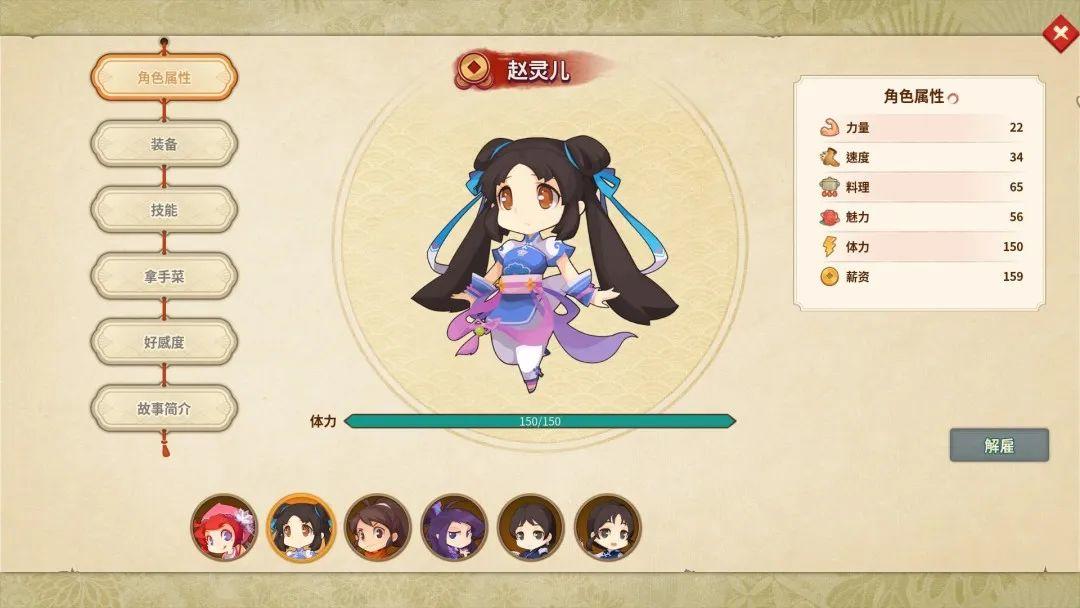 几位来自《仙剑》过去作品的老朋友作为玩家初始的伙计班子,分配工作,适材适所地将他们安排到需要工作的岗位上;在准备开店的时间前购买做菜需要的材料,让厨艺高超的角色提升菜品等级;为腿脚灵活或是勤劳肯干的角色安排训练,提升他们的个人能力等。