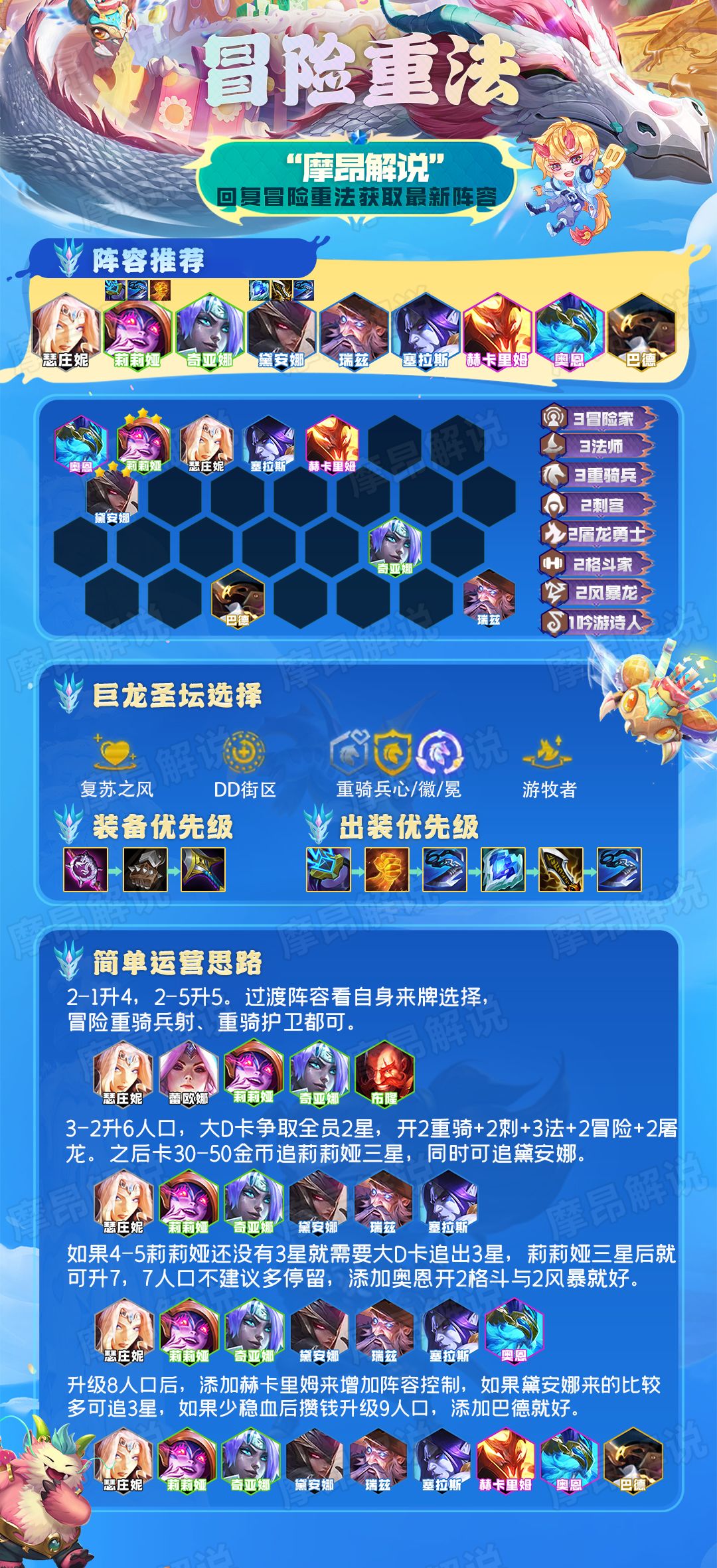 最近很多朋友让摩昂出重骑屠龙莉莉娅,但其实这套阵容的强度非常吃三星的多少,经过几天测试,摩昂发现其实并非一定要开4重骑兵与4屠龙。今天摩昂就把这套改良版阵容推荐给大家——冒险重法。阵容分析