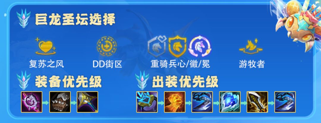 圣龙符文方面复苏之风(极大增加续航)、DD街区(快速成型)、重骑兵心/徽/冕(增加坦度)、游牧者(极大增伤)这几个最优。其他如古代档案、便携锻炉、星界赐福、蓝电池、公里圆弧、狩猎律动、珠光莲花、毁灭冲锋、重骑兵阵线、纷乱/清晰头脑、卢登的回声、冒险/法师/格斗心徽冕与所有在前期能增加经济类的符文都可考虑。阵容简单运营这套阵容是属于6D“D卡流”体系阵容,非常需要莉莉娅快速三星,如果有同行或莉莉娅不胡,尽量不要选择这套阵容。开局第一次选秀拿取大棒、拳套最优,可合成阵容关键装备离子与正义,第一个符文如果有重骑/冒险相关的符文最优。2阶段2-1升4,2-5升5。这套针对装备要求不算太高,不建议连败开局。过渡阵容看自身来牌选择,有丽丽亚直接上,冒险重骑兵射、重骑护卫都可。装备上优先合成离子与正义,这两件装备都是前期稳血神器,非常容易连胜。
