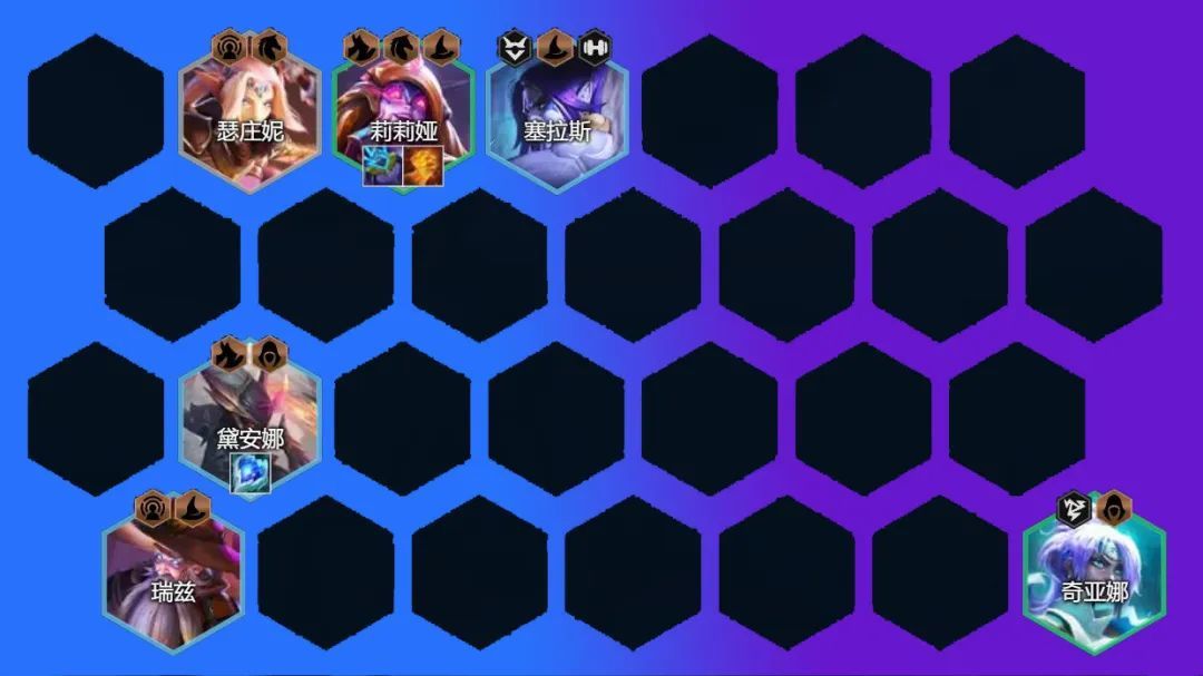 3阶段3-2升6人口,如果莉莉娅来得多就可选择这套阵容。大D卡争取全员2星,开2重骑兵+2刺+3法也可不开2刺开2格斗羁绊。之后就可卡着30-50金币追莉莉娅三星,同时可追黛安娜,如果不卡利息可留奥恩。