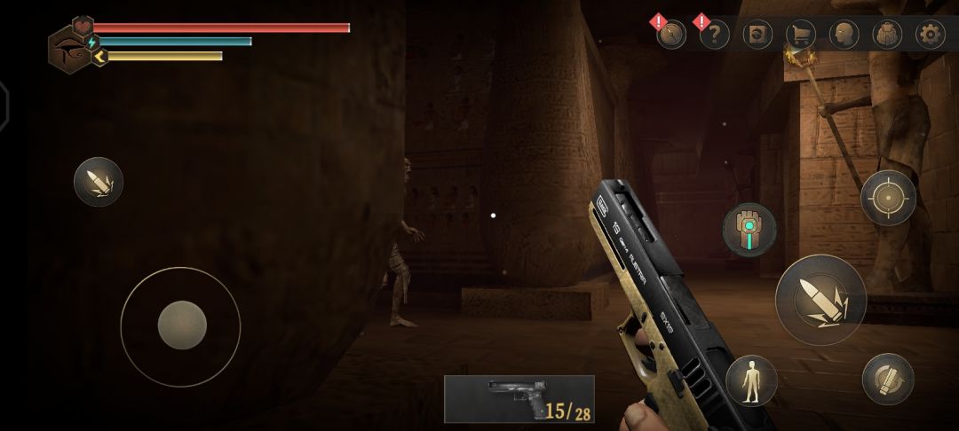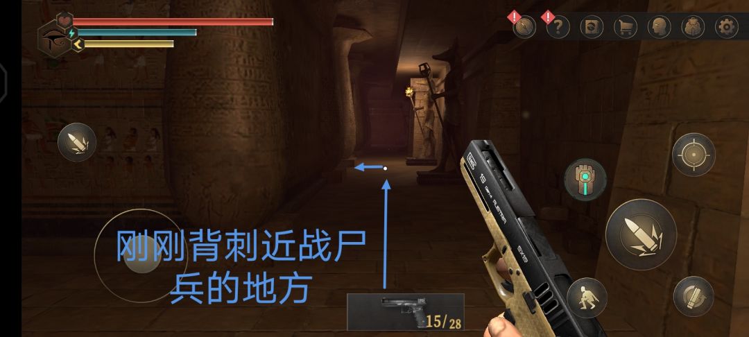 44.到达法老墓室,先去左边,这里敌人较多,在如图所示的地方等待近战尸兵,找准时机进行背刺,并且注意弓箭尸兵