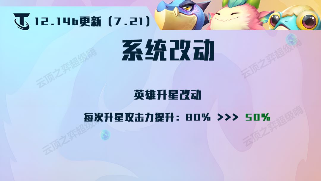 新版本系统改动主要是针对于D卡流的阵容,每次升星攻击力提升从80%削弱到了50%,对于以攻击为核心的D卡流阵容削弱比较大。