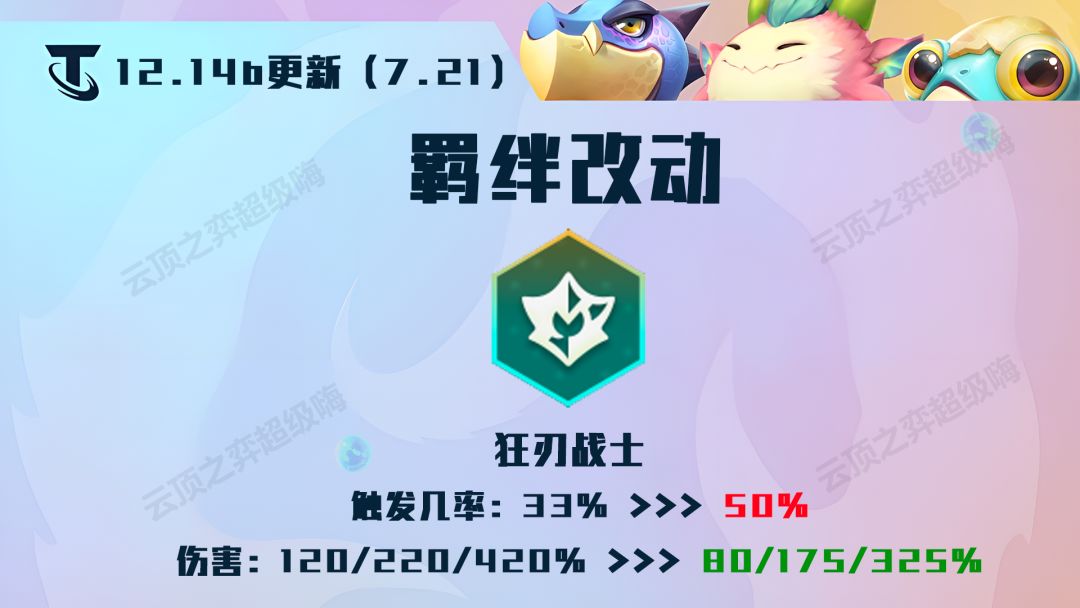 解析:主要看狂刃战士的改动,虽然攻击力加成削弱了,但是触发几率提高的,具体是否是大削弱需要看后续的实战!
