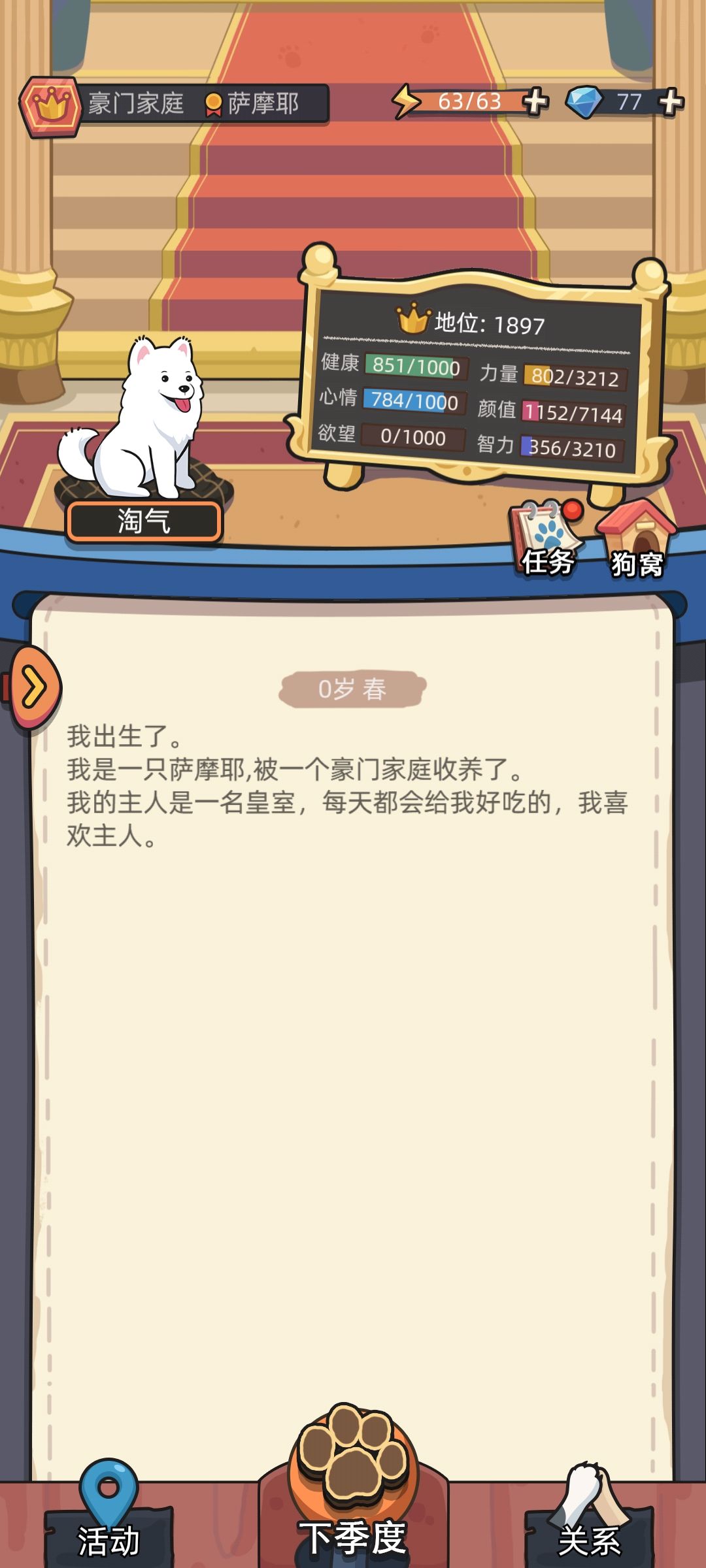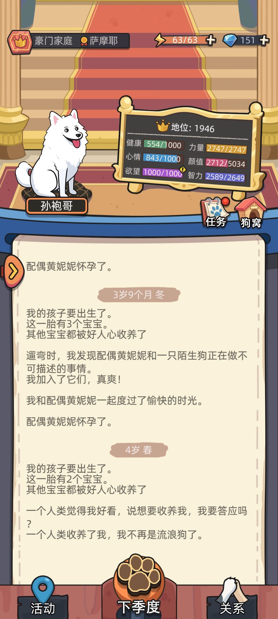 我的N代土狗成年死主人不过还好主人还有家人,赶快找了个高属性萨摩耶免得被遗弃了找不到豪门狗。N代土狗的属性基本随便找个萨摩耶后代都能进豪门了。