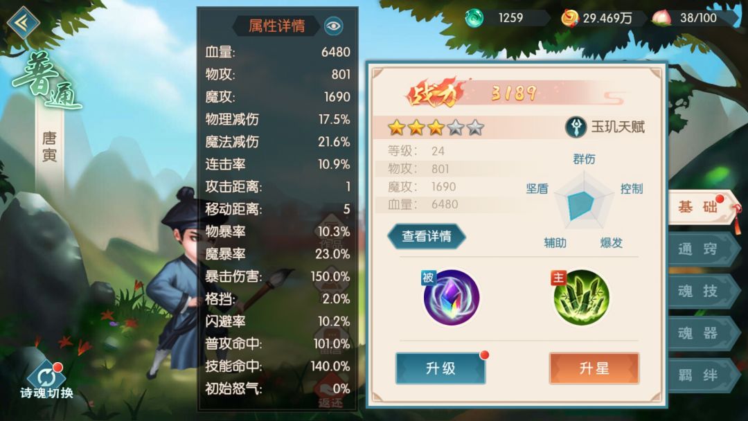 1、我们在人物界面点开详情,可以看到每个角色的详细属性