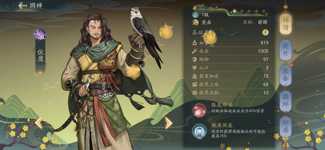 3)伏鹰,准备挖宝,出城之前换上阵,注意载重过低会出不了门,高级物品概率+75%