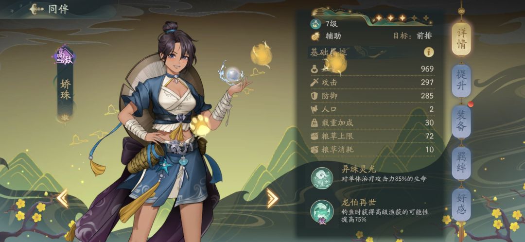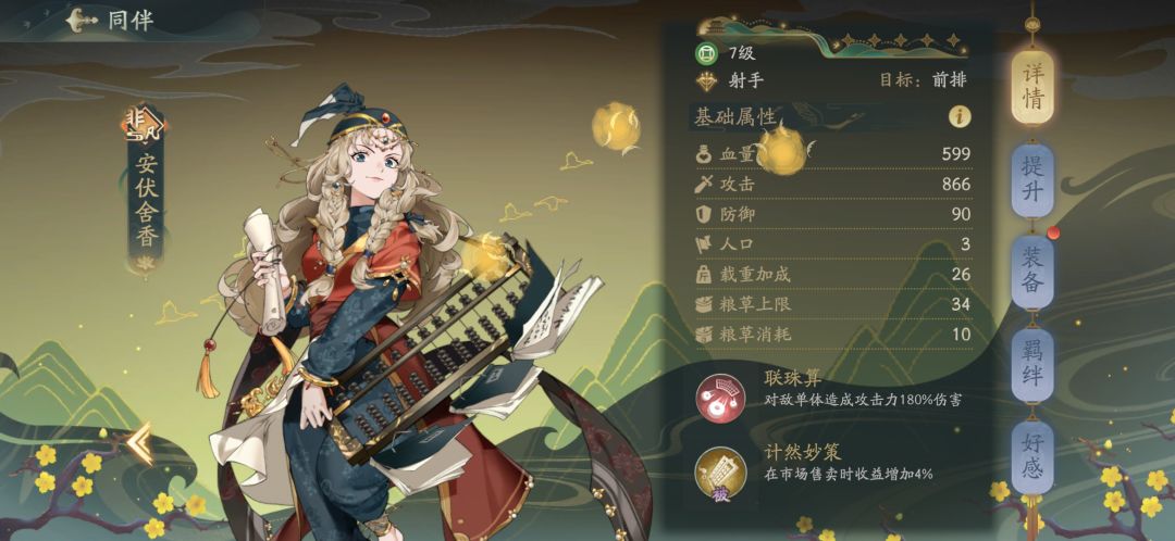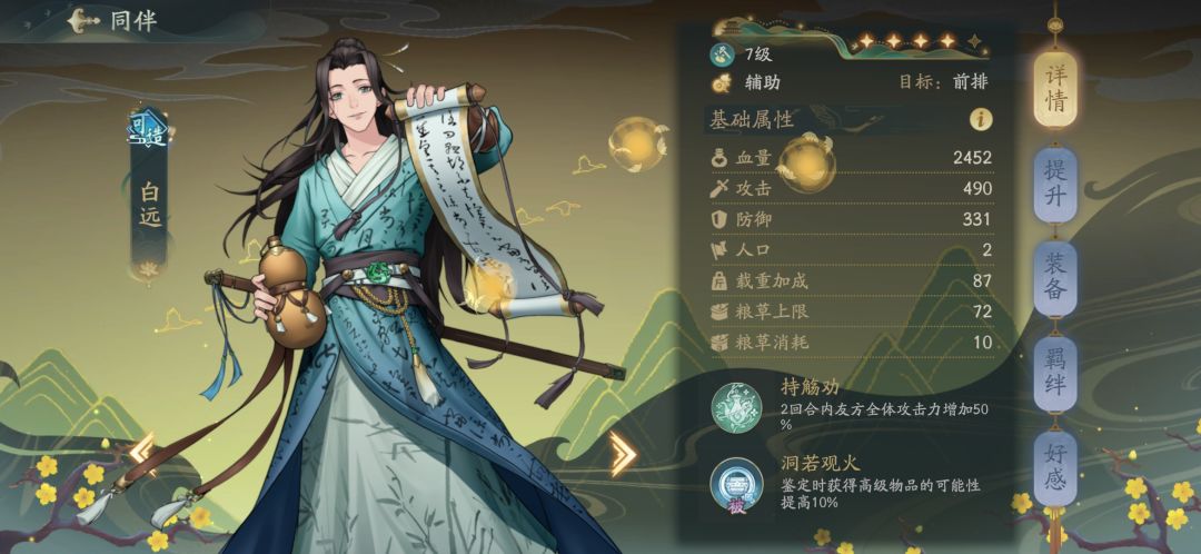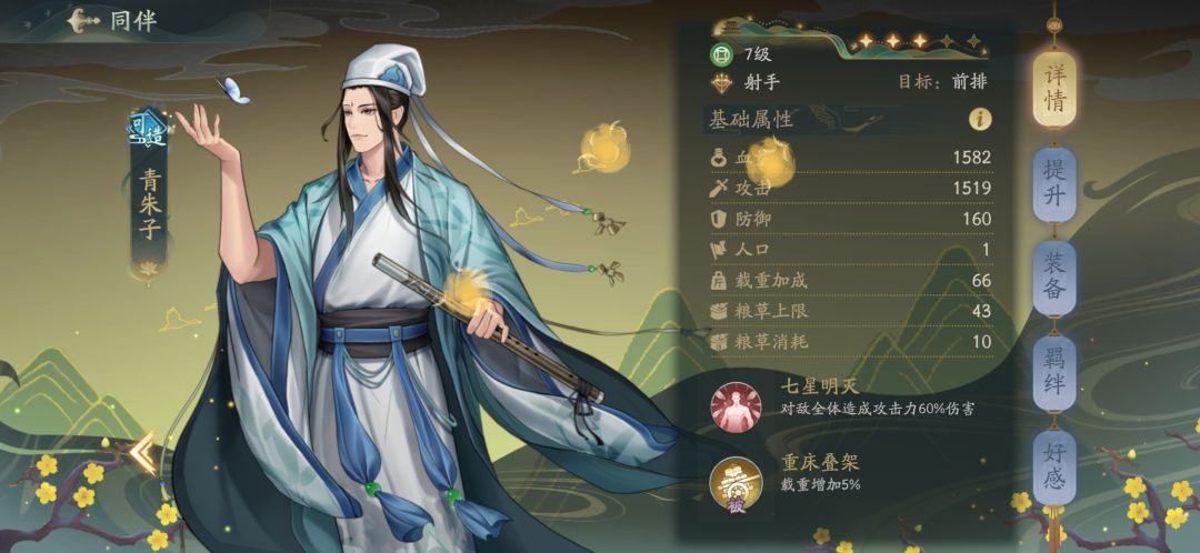 5号位:青朱子,被动全队载重+5%,提高货运量,方便跑商