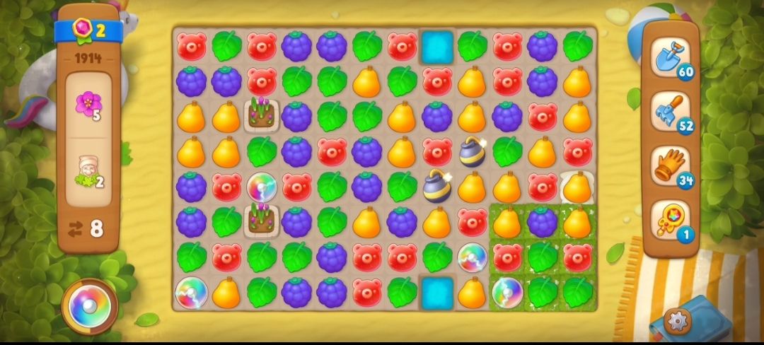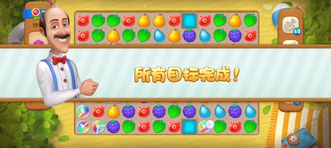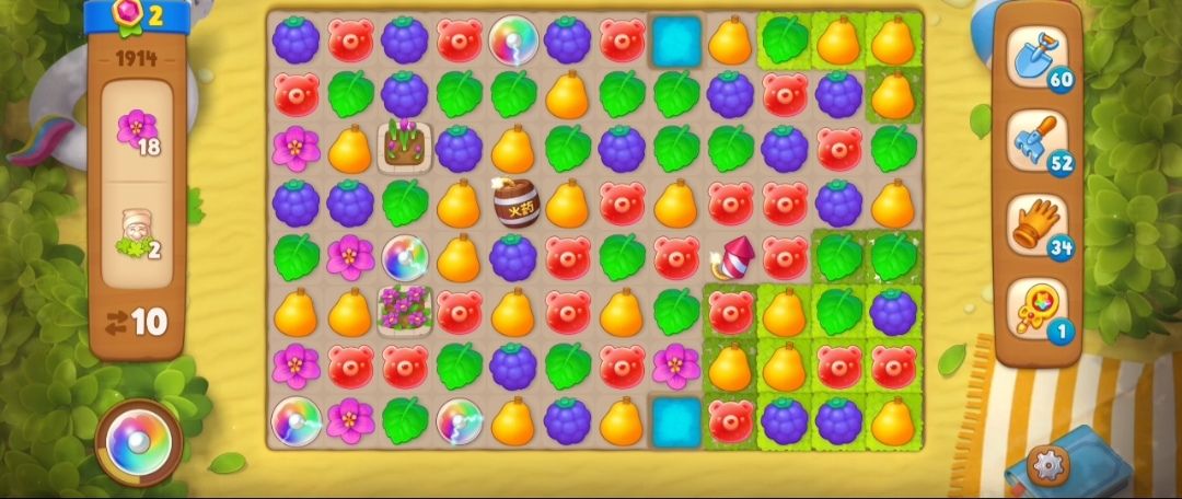 ⑥这里的草地分为三种,没完全覆盖的草地在草地上一次元素匹配就可以消除,完全覆盖的草地需要两次元素交换,带小花的草地需要三次元素交换才可以消除,消除有小矮人的草地,就可以收集小矮人了。