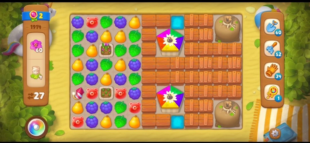 ⑤这一关的另一个过关目标是小矮人,小矮人在树叶袋里,所以要在树叶袋旁边元素匹配,一个树叶袋需要在树叶袋旁边交换三次元素才会放出带着草地的小矮人。