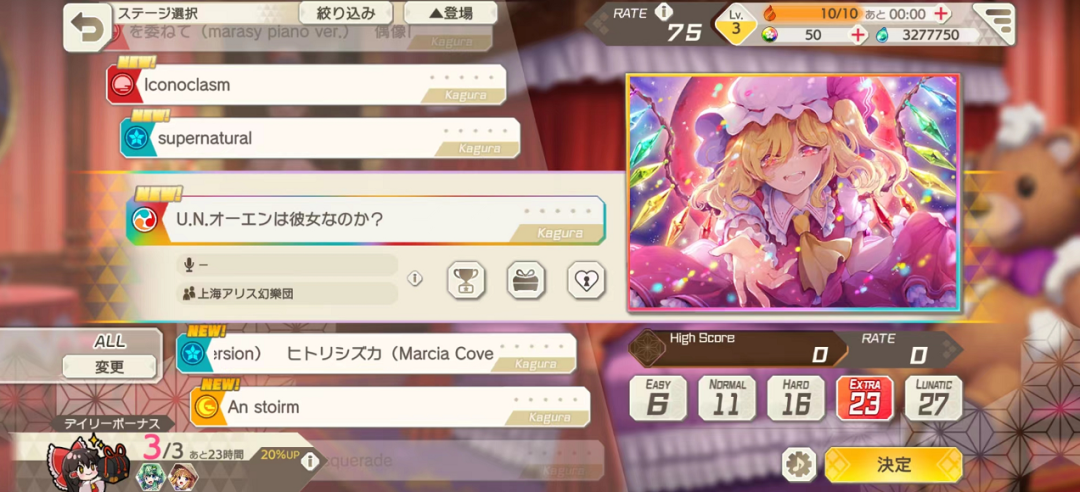 而重头戏的打歌部分才是音游的灵魂。游戏保持着每次活动都更新新曲的态势,马不停蹄不断丰富曲库,甚至到即将关服的10月都还有触手猴的版权新曲加入。从为人熟知的东方热门本家曲,到一些不太为大众所知的同人社团曲,皆有收录。经过一年运营,游戏曲库阵容已经能够满足大部分东方爱好者的需求。