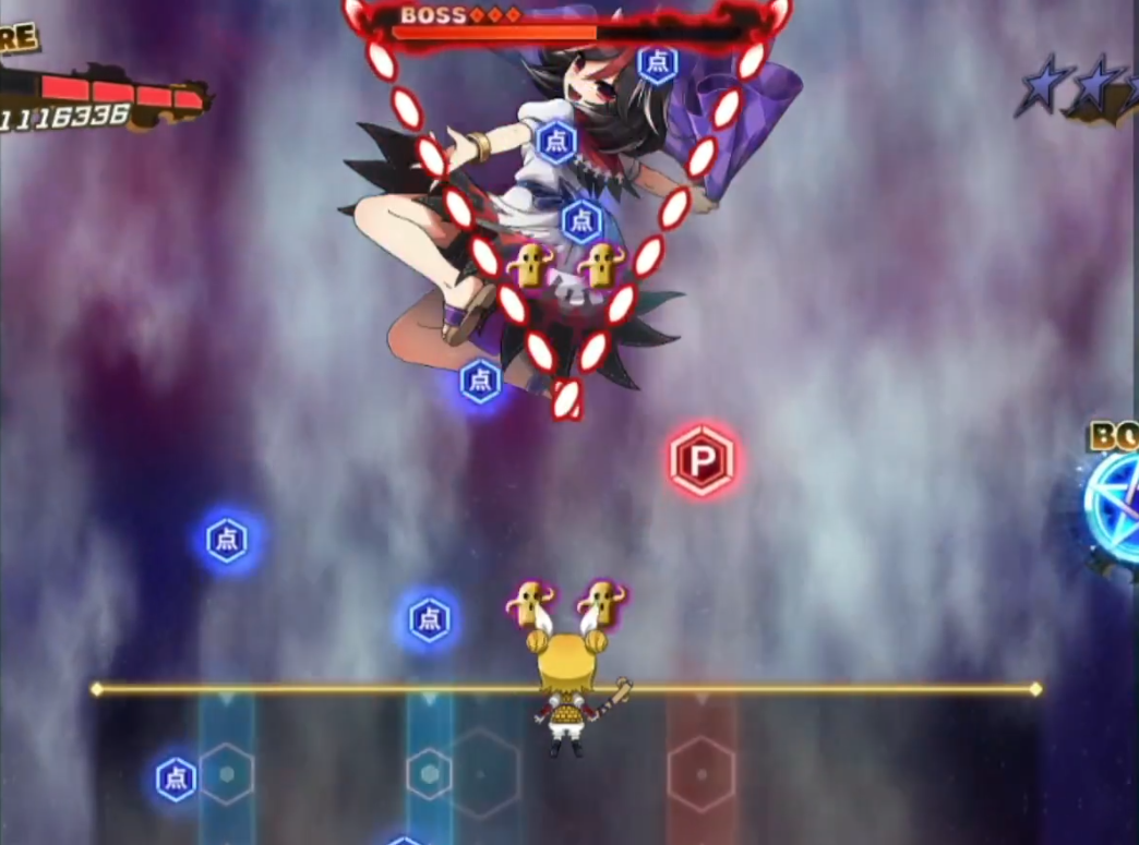 但是到了实际打歌的部分,《弹幕神乐》又整了许多花里胡哨的花活——不仅仅是特效酷炫到可能遮挡视线的技能触发、和颜色混乱且种类众多的NOTE这些“音游通病”,还有加入了一些仿东方原作的“STG”画面的“东方接水果”玩法,以及出现些复数血条的BOSS对你穷追猛打的玩法……