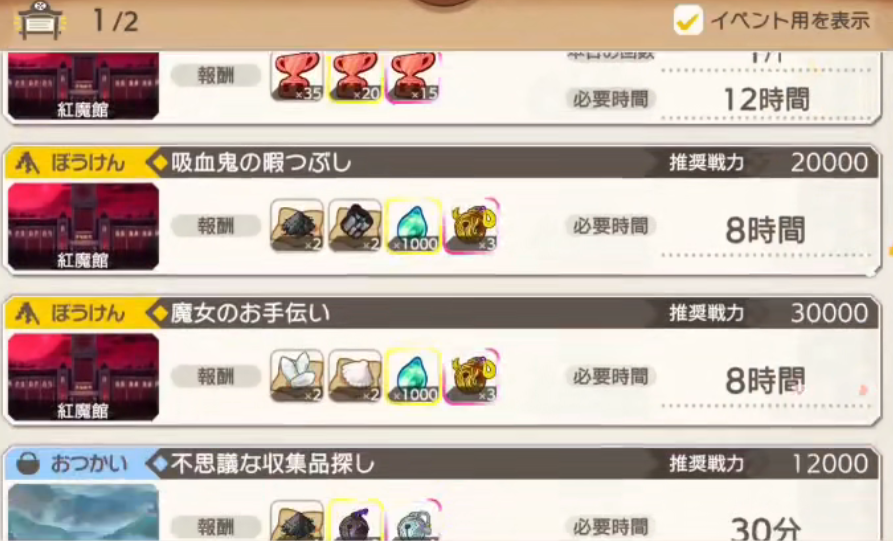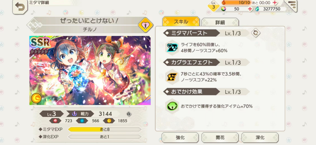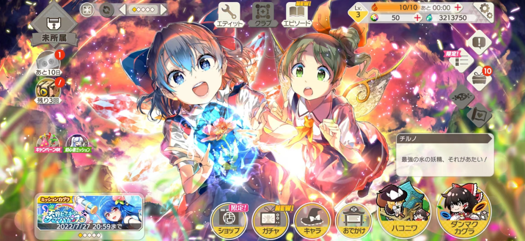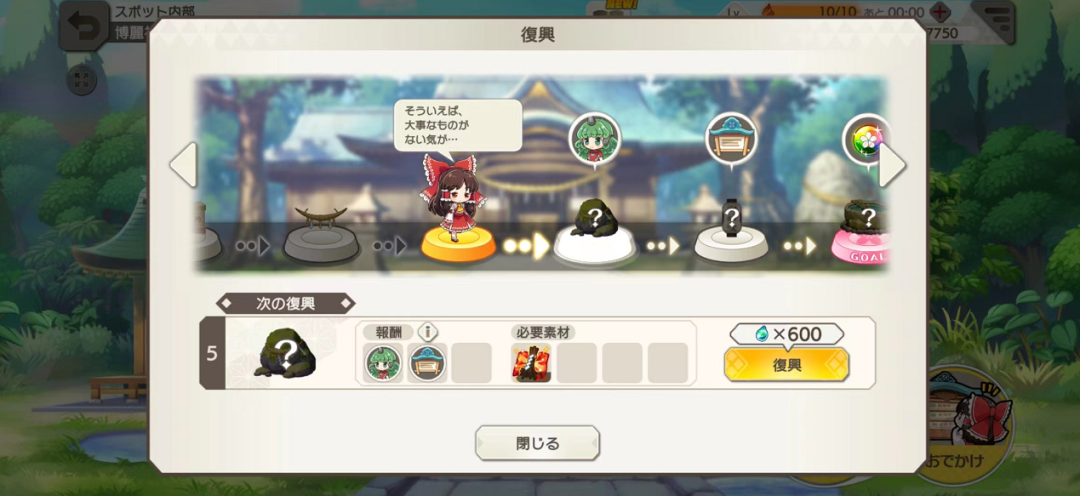 和普通二次元氪金手游一样,本作也是由抽卡养成打歌看剧情构筑起来的那一套。不过,市面上常见的二次元音游,大多以剧情+打歌+角色养成的主要框架构建出游戏的玩法循环,简单易懂,但在《东方弹幕神乐》中,除了打歌之外,玩家还需要消耗现实时间“派遣”角色们去冒险搜集素材,用这些素材来修复幻想乡中被毁灭的设施,重建幻想乡,才能推进游戏剧情。