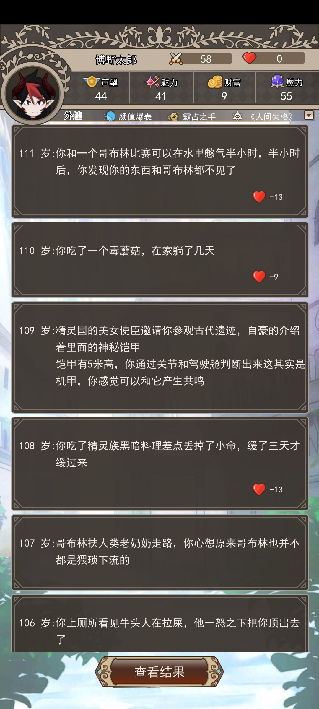 这游戏属于养成加找虐的玩法,可以养老婆~~~~游戏内每隔50岁会有一个大劫(勇者追杀)(矮人王挑战)1-50岁叠属性很容易50-100疯狂扣属性就是玩死你那种扣法踩个史莱姆都能扣10点血那种。