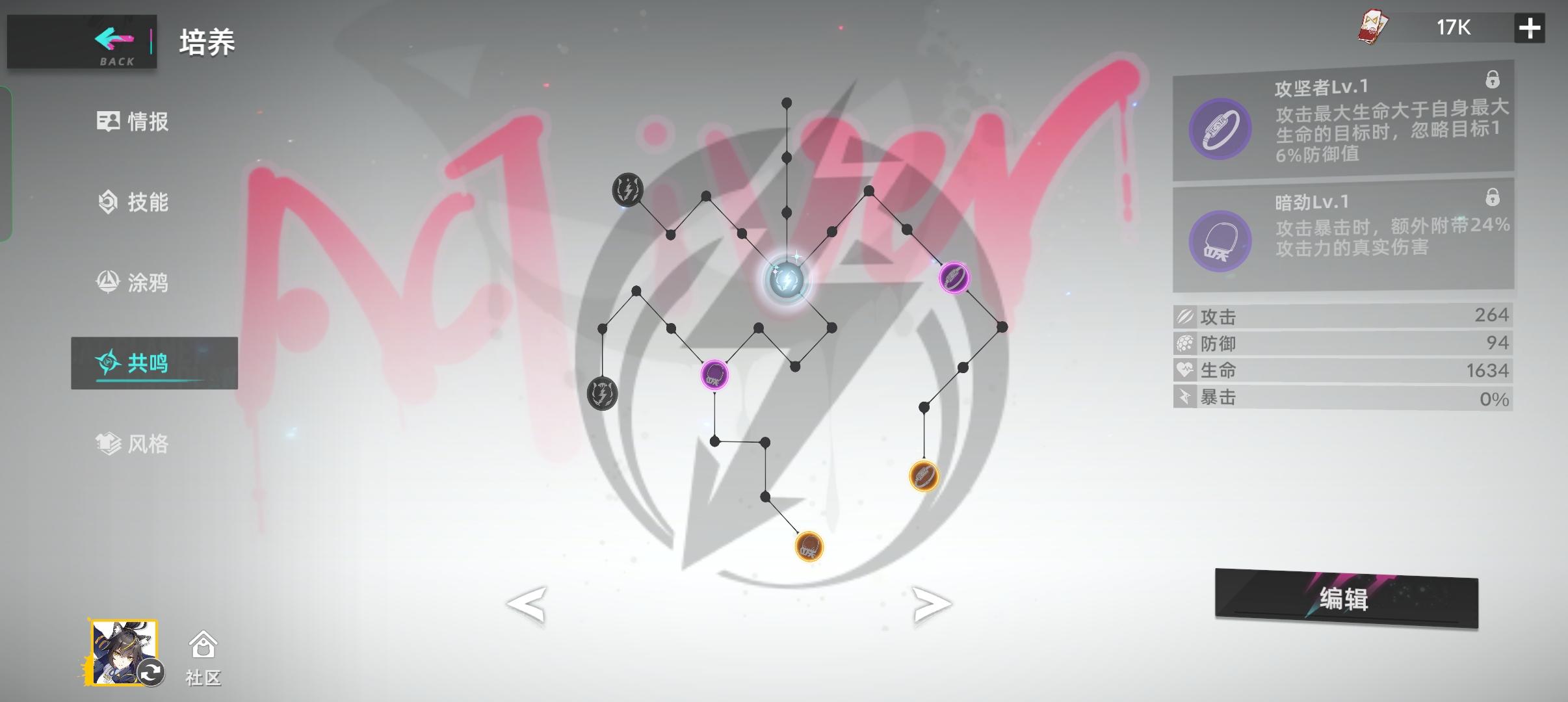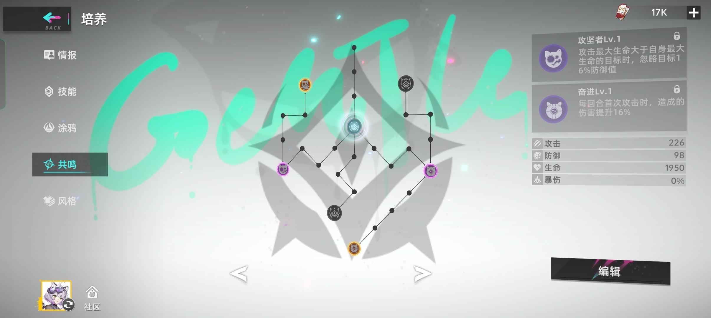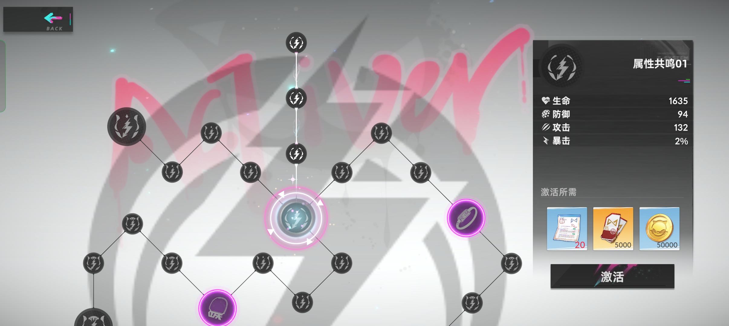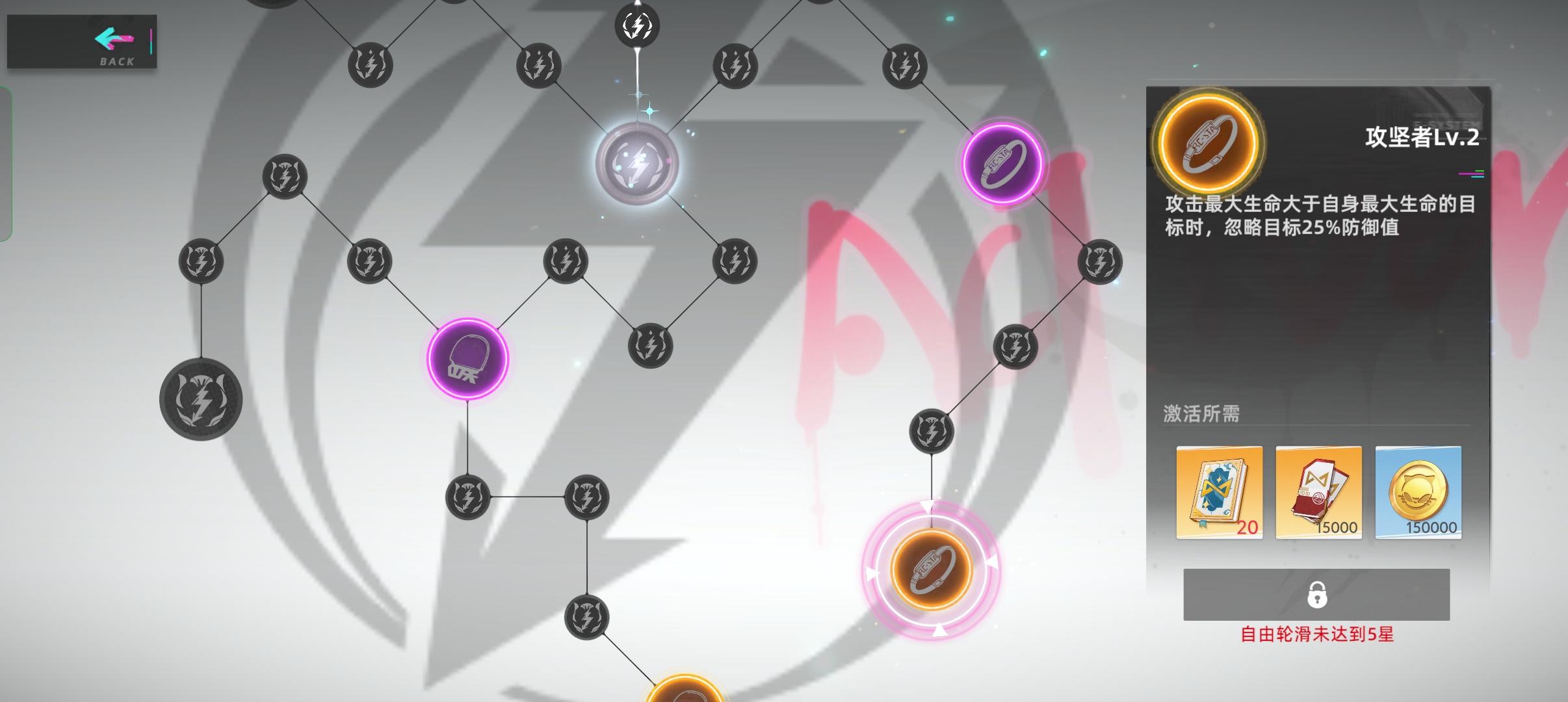 下面这张是滑轮共鸣属性的放大,目前我只能激活前三个节点,第四个节点需要的要在挑战中获取(40级解锁)前三个节点属性分别是: