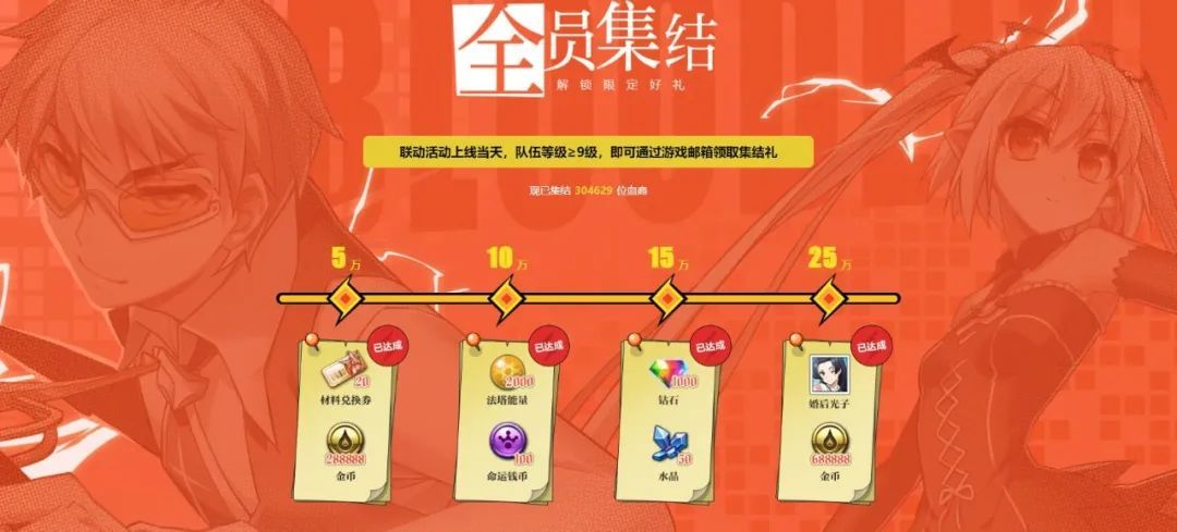 恭喜超能的血裔们完成全阶段集结,成功解锁联动预约所有奖励!只要角色等级≥9级,今日上线即可通过游戏邮箱领取:婚后光子*1,钻石*1000,法塔能量*2000,命运钱币*100,水晶*50,材料兑换券*20,金币*977776!