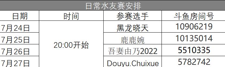 斗鱼水友赛活动也将在7月24日—7月27日如期举行,水友可报名组队或者拼手速进房间对主播发起挑战,同时游戏官方也将配合给予传播并给予相应游戏道具支持,主播将在固定时间段开赛为大家献上刺激的对决盛宴,精彩PK不容错过!