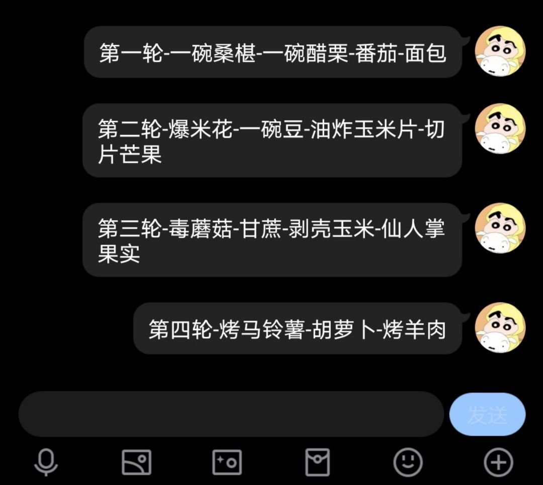 主食我准备了七种(醋栗胡萝卜兔肉派-醋栗胡萝卜派-两种牛奶-羊肉派-兔肉派-羊肉串)如果沙漠雨林待的多的话可以多准备几种