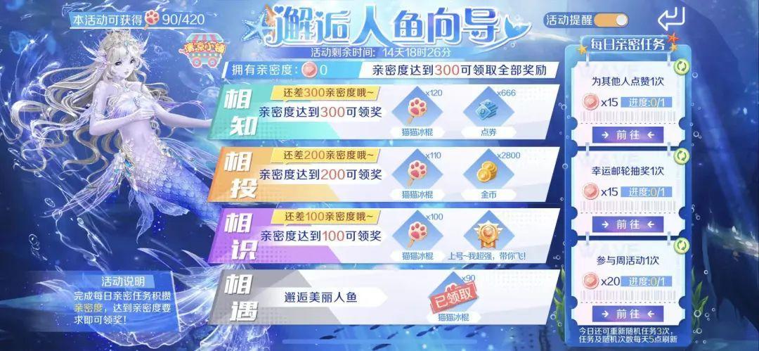 截止至8月5日,来参与【邂逅人鱼向导】活动,达到指定亲密度就能免费领取专属称号【上号~我超强,带你飞!】和猫猫冰棍!