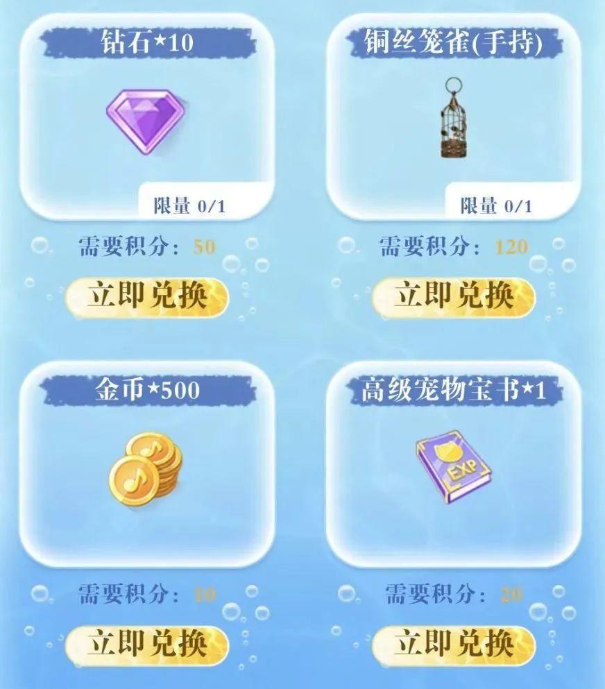 签到可得点券*166、高级魔法种子*1、扭蛋币*3、干饭人干饭魂称号、金币*100好礼!完成任务领积分,可兑换钻石*10、精美手持-铜丝笼雀、高级宠物书*1、染色剂礼盒*1、金币*500的丰厚福利!