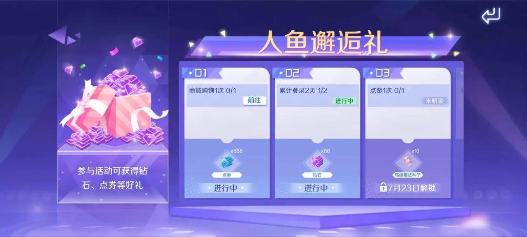 截止至7月28日,参与【人鱼邂逅礼】活动完成任务就能领取点券*888、钻石*88、高级魔法种子*10、高级宠物宝书*5、金币*1888!