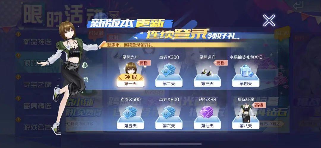 截止至8月6日,连续登录游戏共计可带走高档套装-星际征途、头发-星际光年、鞋子-星际远洋、水晶抽奖礼包*10、点券*1600、钻石*88!