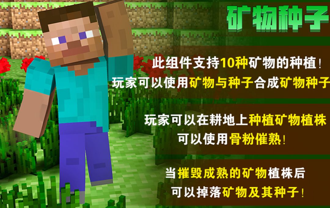 各位冒险家是否会因为在矿洞中不停挖矿而感到身心俱疲?那这款组件一定不能错过!下载这款组件后,各位冒险家将获得多达十种类型的矿物种子与矿物羊。只需将种子播种在土地上,矿石就能够以植物的形式从泥土里长出;还可以选择修剪成熟矿石羊的羊毛,一样能够获得所需的大量矿石。快来体验不用下矿就能获得矿石的快乐吧!
