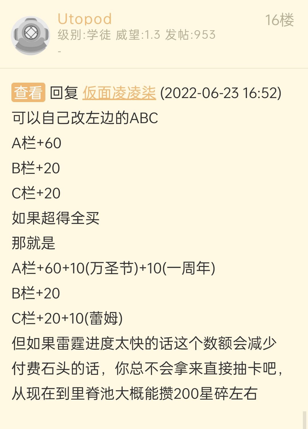 7.24更新,这个时间点正好方便重新计算一下,于是更新了补给A的内容,我想大家应该都能拿到溢光的1500石头吧,所以这205抽是算上了竞速结算奖励的,顺带提醒,补给C的抽数不一定准,可能算少了,这个不太好算。