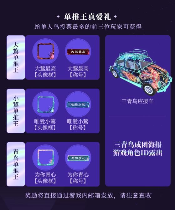 此外,每个角色助力的前三名玩家将会获得额外的限定好礼,包括限定头像框、限定称号、应援车千乘,你们的角色昵称也将在最终的成团海报上展示!