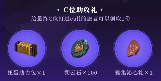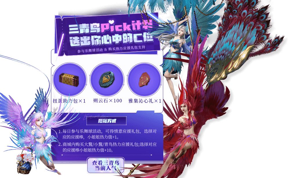 当然,如果你应援的三青鸟角色最终人气最高,所有助力她的玩家都将获得【助攻礼】,礼包包含扭蛋助力包*1,朔云石*100,雅集沁心礼*1,