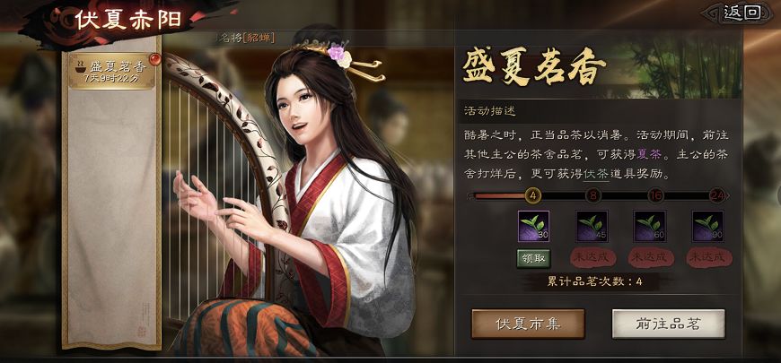 首先,出了一个暑期活动:盛夏茗香。活动时间在7月22日——7月29日,只要是势力值大于等于300的主公都可参与。前往其他主公茶舍品茗,可以赢取夏茶奖励。在茶舍打烊后亦可获得伏茶道具奖励。夏茶能够兑换奖励,伏茶能够出售获得金珠。大家都可以积极去参加哦~