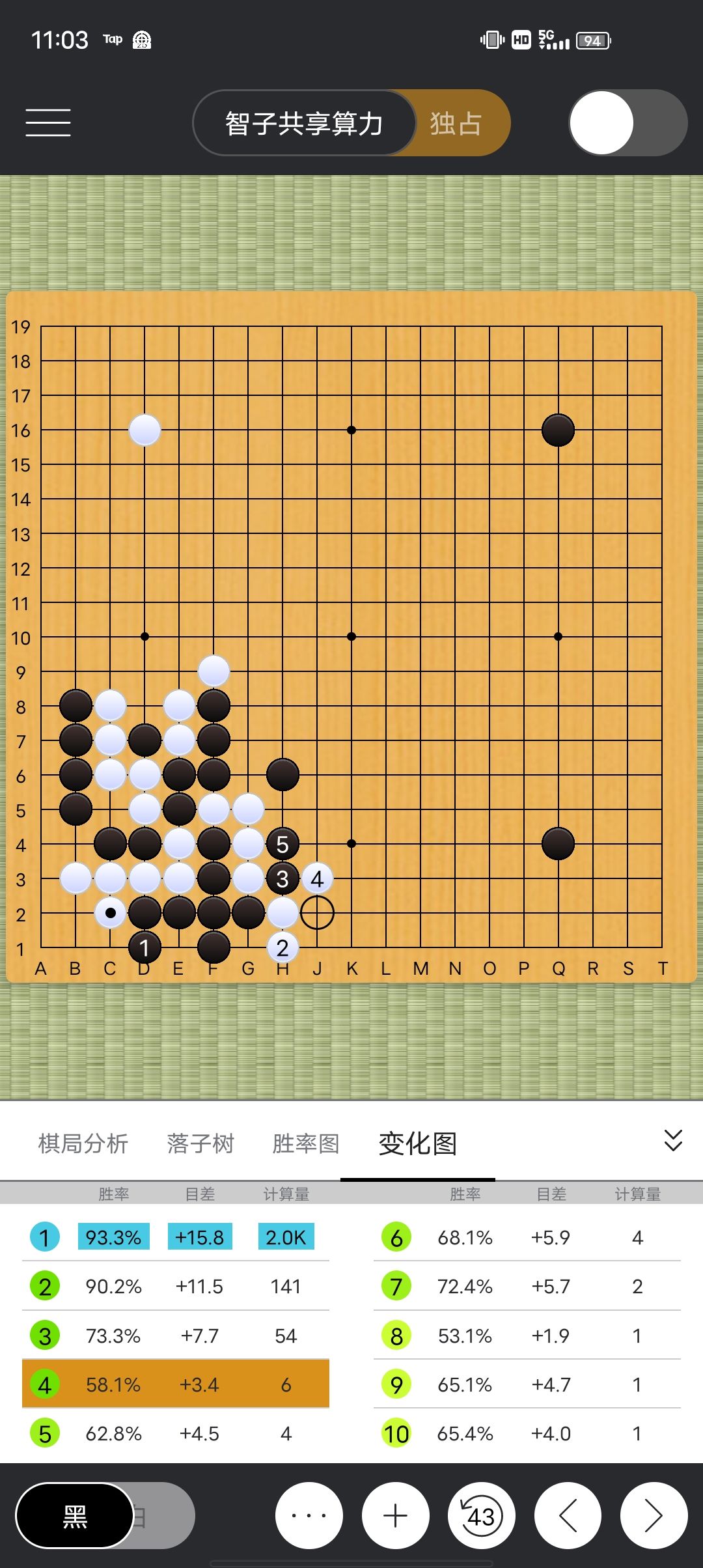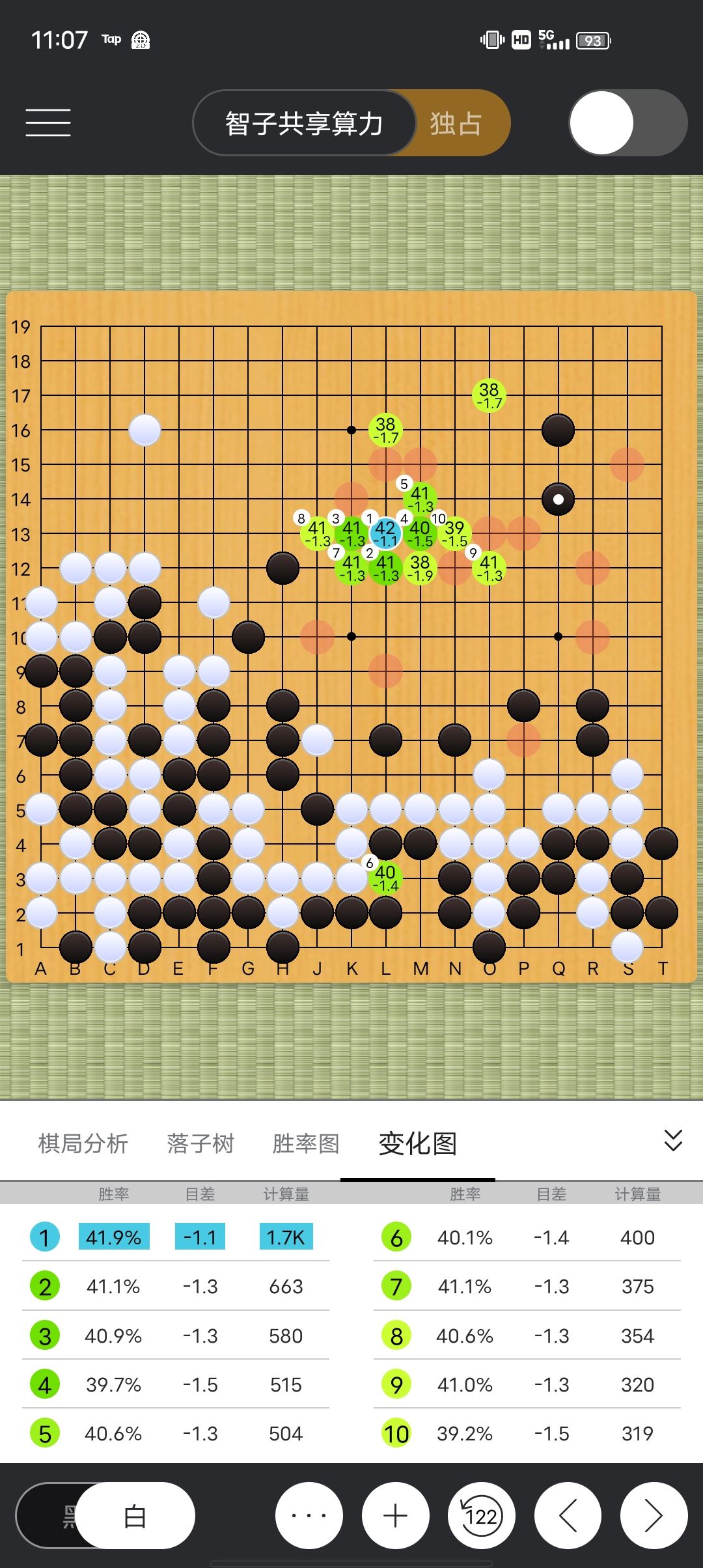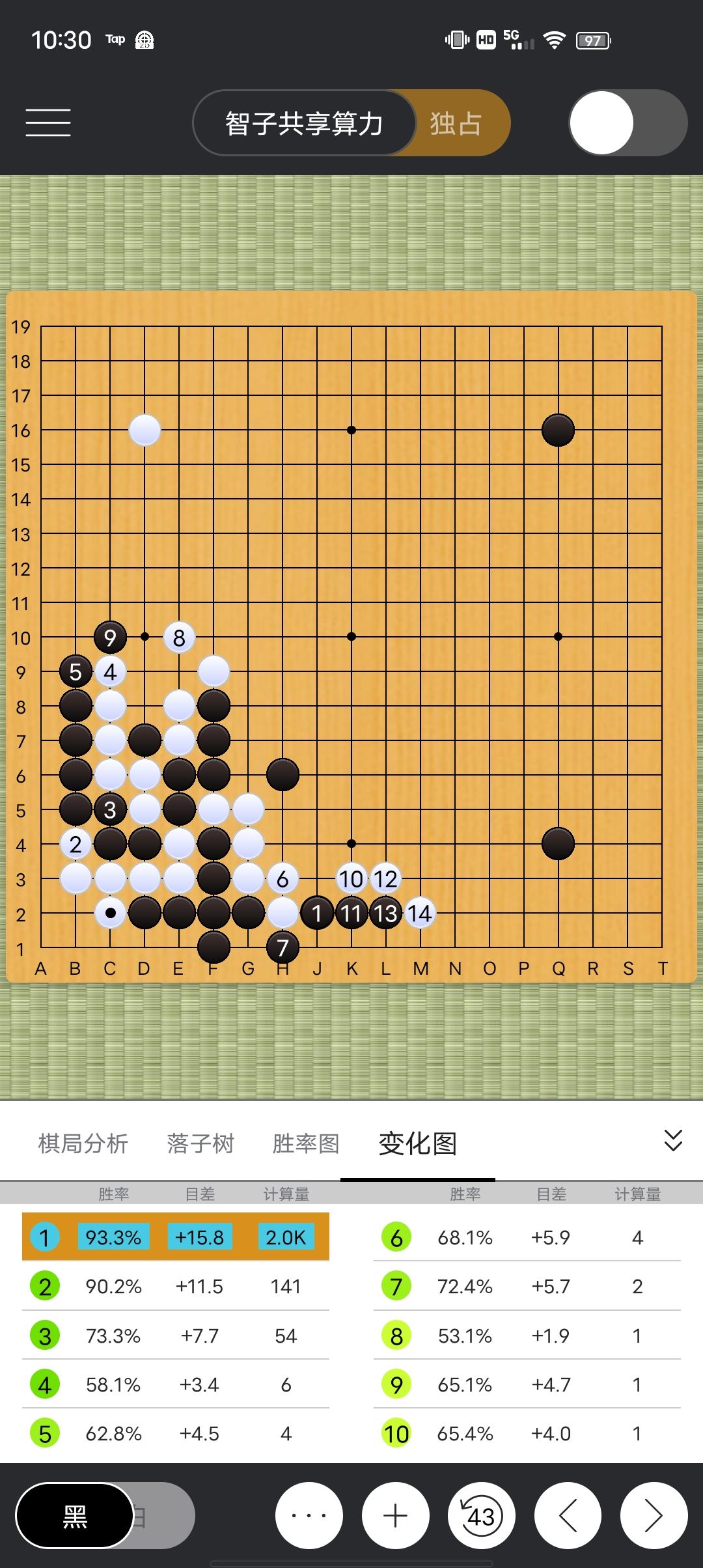 点开第1个变化图,发现算了14招,按这14手下完黑棋领先15.8目胜率93(胜率就是根据目差判断的)