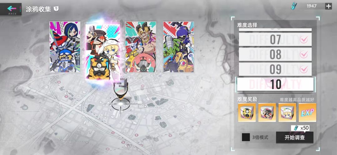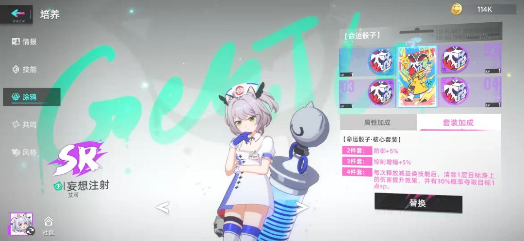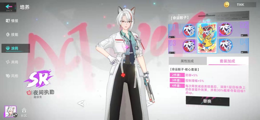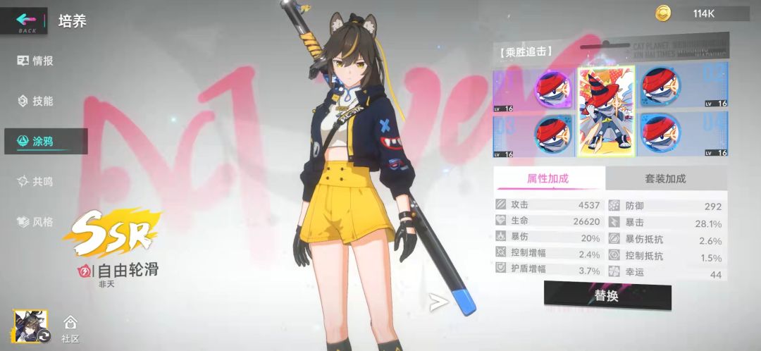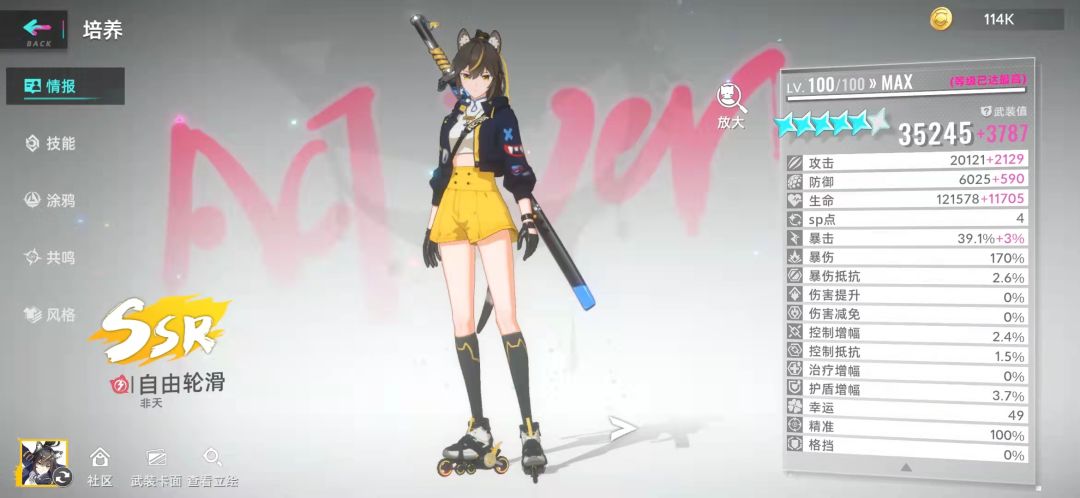 轮滑练度五星一百,共鸣走的是暴击真伤(不过最后一格没有资源点,涂鸦也是蓝色的,不过升满了,剩下三个不需要练度,夜间执勤和妄想注射涂鸦带了骰子,加点控制命中只能说聊胜于无吧,具体见视频
