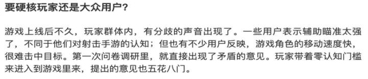 话说回来,如此明显的设计错误,难道王牌战士策划这种专业的业内人士会看不出来吗?我们回过去看上面的几张关于王牌战士设计理念的图片(图1、图2、图3)。主策划在图中表示了策划组顶住了来自硬核玩家的压力(辅助瞄准过强等问题),去迎合非硬核玩家的体验(角色移动过快,很难击中敌人等)。主策划尝试通过加强辅助瞄准等一系列方式来降低王牌战士的操作难度,从而使王牌更适合非硬核玩家。而我个人认为,推出简单的高强度角色也是策划为了使王牌非硬核化的方式之一。至于这些非硬核化措施为什么没有促使王牌战士按照策划所想象的方向发展,我会在后续的专栏中解说(篇幅所限,这篇无法写完这么多的内容)