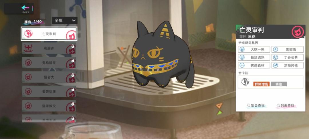 首先点进猫窝图鉴里面的主题图鉴,在里面选一个自己想要配的主题,并记下需要的所有基因(包括蓝色合成基因和绿色基础基因),然后再在自己目前已拥有的所有猫球中找到主题猫需要的基因最多的一只开始基因提纯之路。接下来为了方便理解,我拿我已配出的主题亡灵审判举例