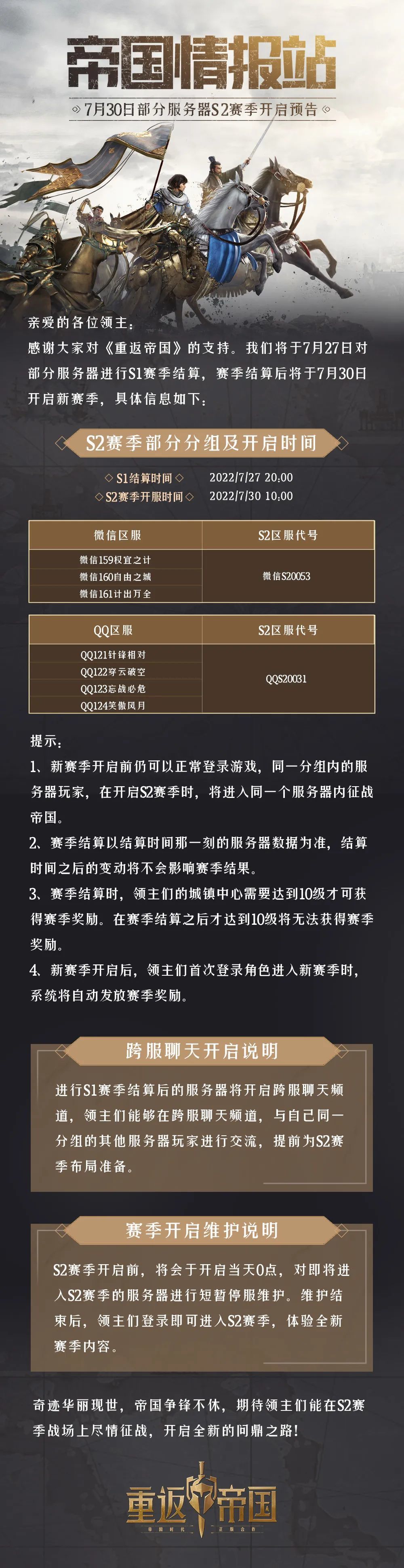 7月30日部分服务器S2赛季开启预告