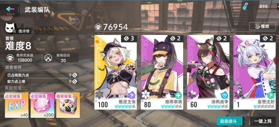 我的主C是5星100级的叛逆,boss刷新护甲的时候会清掉所有负面buff,叠不上电混输出很慢,一般7-8回合单C可以打死