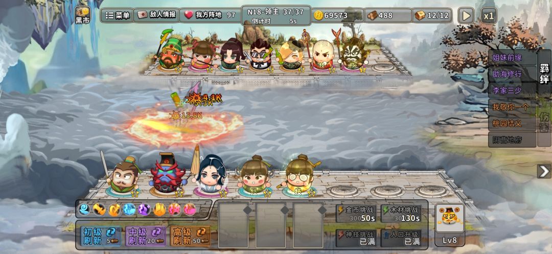 打法:前期一二回合看到啥上啥,别选三藏沙僧这种辅助就行,啥牛头马面、波蹦儿霸、刘备、金吒木吒随便上三四个在怪出来前可以把金币怪打了,然后攒一攒,第二回合升5人口再随便上个蓝怪就可以把木头也打了,后面就有啥拿啥了,刘备金吒木吒小青这四个蓝可以升级,其他有更好的紫卡直接卖,如果前期能拿到哪吒金吒木吒组合再搭配两个紫卡可以早点打神技,后面就是一直d20凑阵容升人口,紫角快满了就可以开始d50找橙卡了,神技的话首选cd,当cd减少到每个人的技能cd都是六秒左右就可以不用继续堆了,找找技能伤害、暴击率、暴击伤害这种,缺木头的阶段可以升升5级人物技能,也跟上面一样。