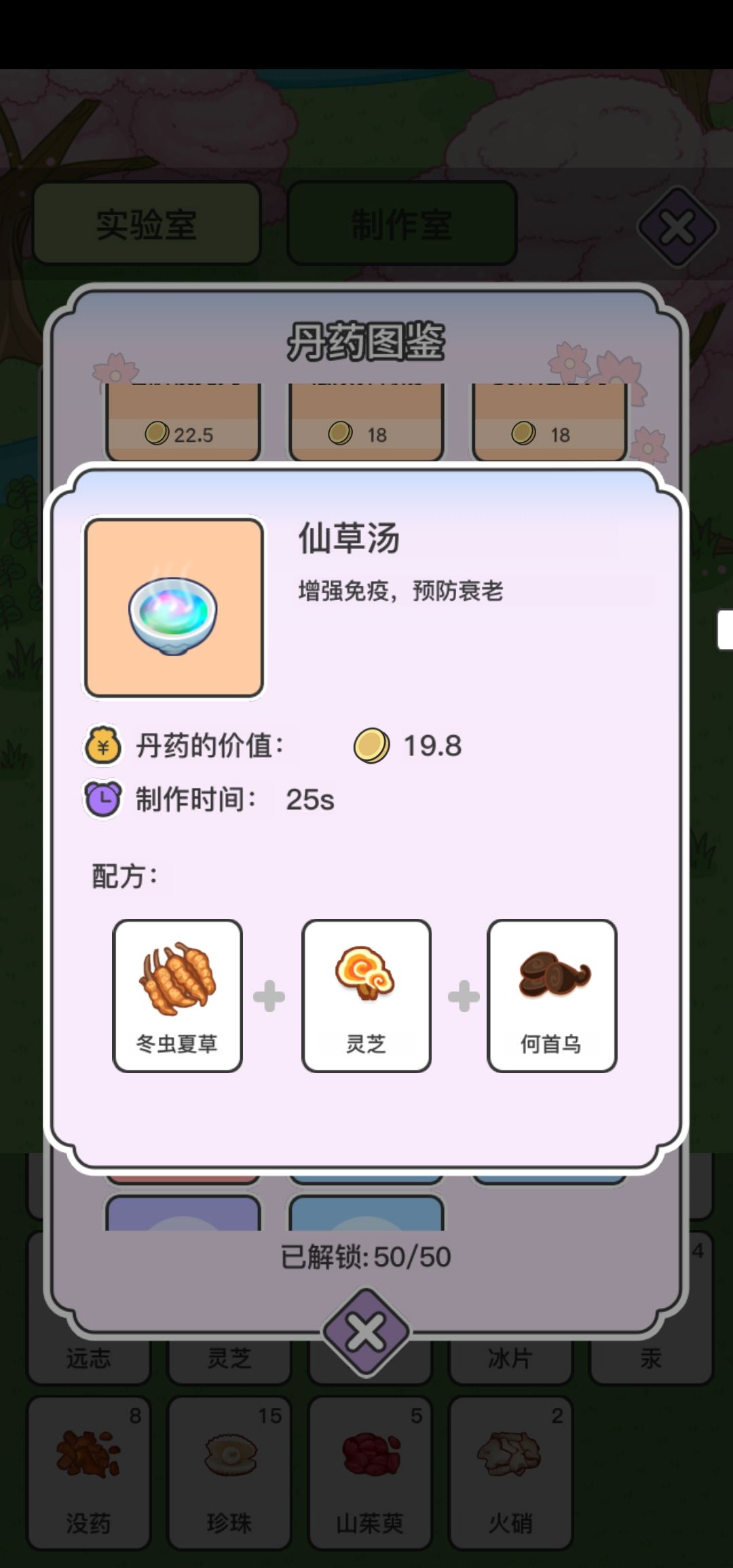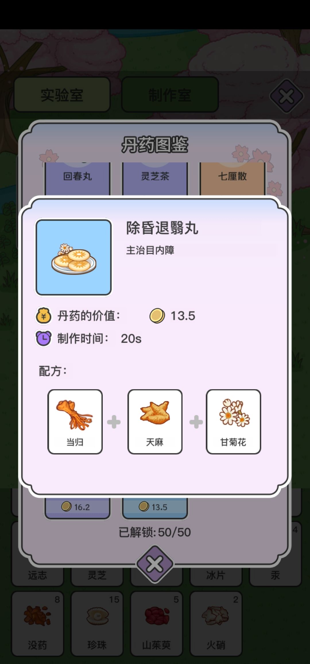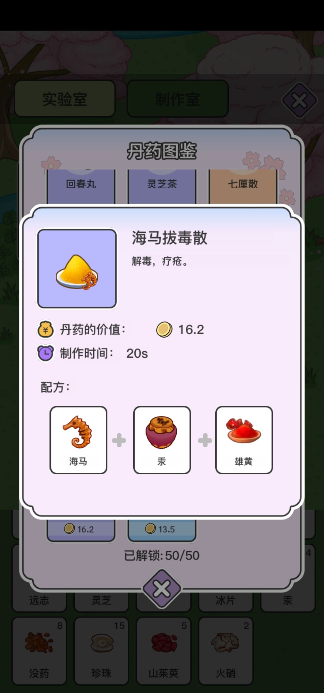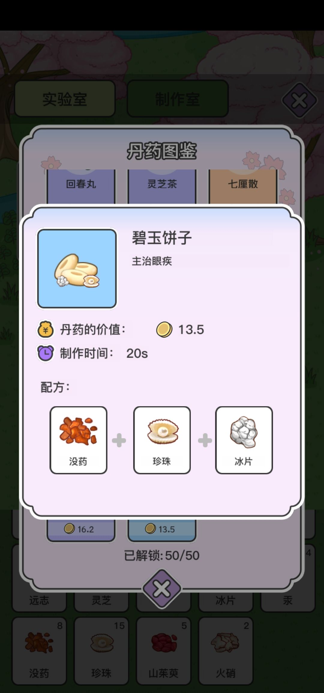 是不是只有我这么无聊😢😢😢这游戏感觉凉了~好吧也不管有没有人看了_(:з」∠)_哈哈哈反正50个配方齐了~第一个随便怎么合成都能合出来就不贴了~