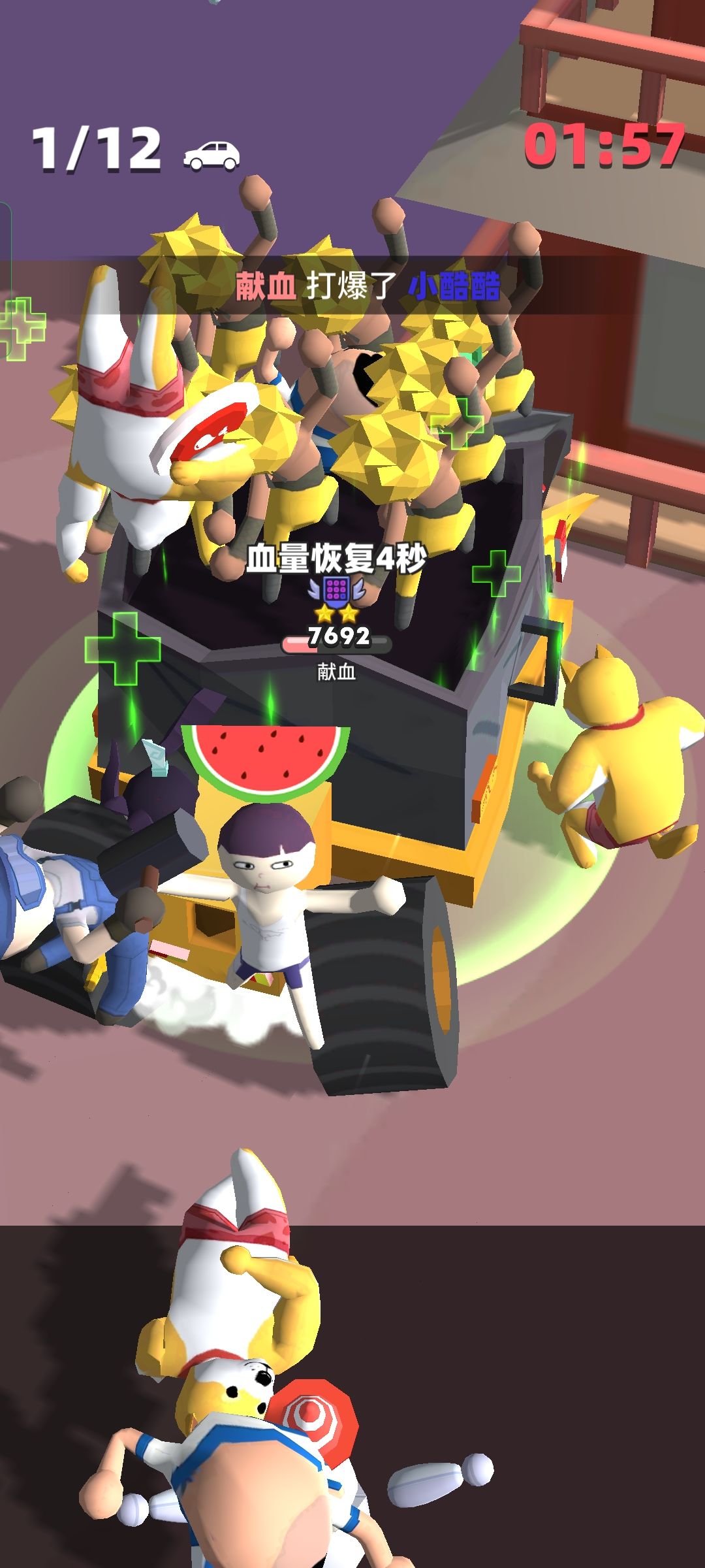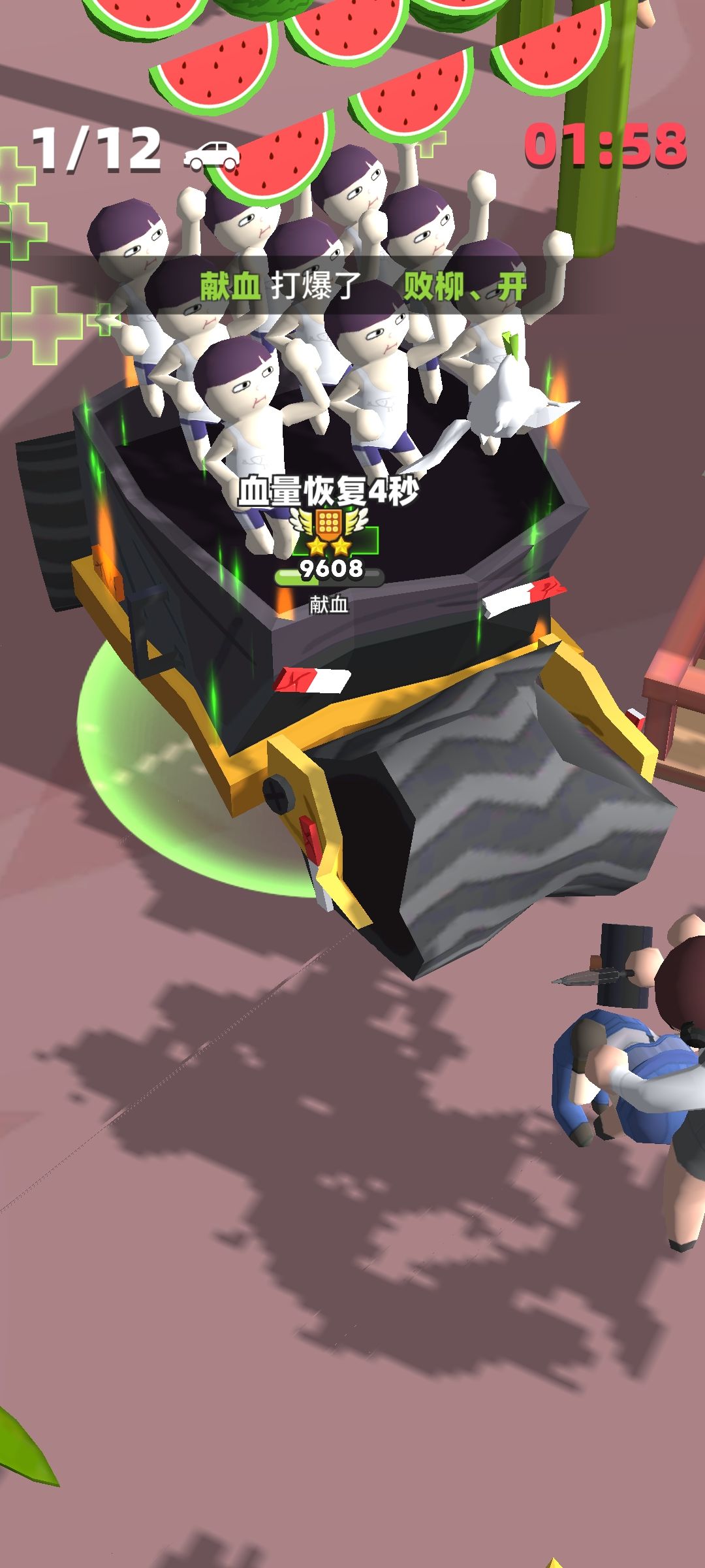 然后说一下玩法,就是开车到处接人,到处跑,打人,躲开掉落的地板,活到最后。解锁完全部人物之后,每局会随机不同的九个人物上阵。