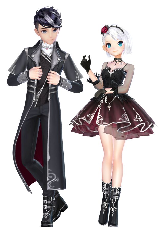 魅夜舞曲男装仿佛暗夜行者,神秘又庄重;魅夜舞曲女装身上的黑羽高贵冷艳,裙摆好似融入了最美的那抹晚霞。