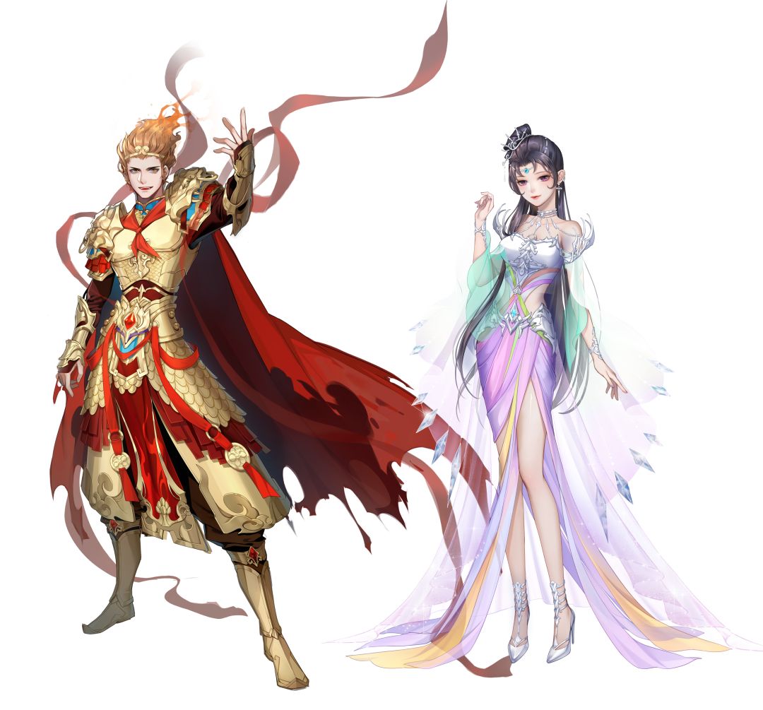 齐天大圣金色的铠甲霸气外露;白骨晶晶女装的薄纱勾勒出了迷人的线条,美艳动人。
