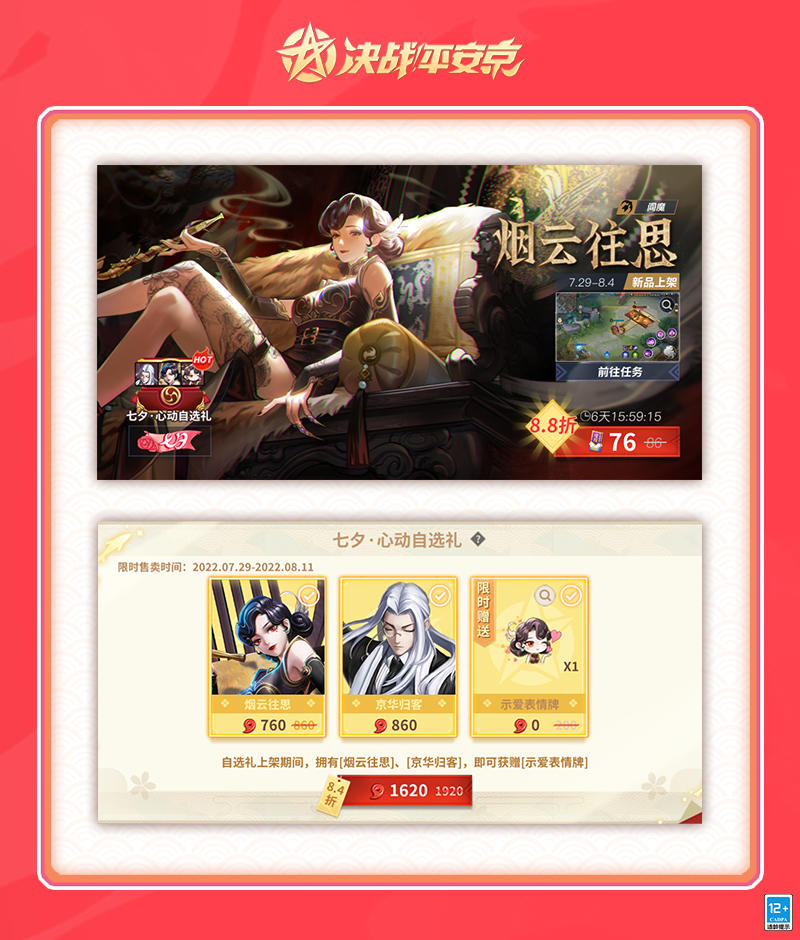 7月29日维护后-8月11日,[七夕·心动自选礼]全新上架[商城]-[杂货铺]。上架期间,拥有阎魔「烟云往思」、判官「京华归客」即可获赠[示爱表情牌],大大们请勿错过哦~