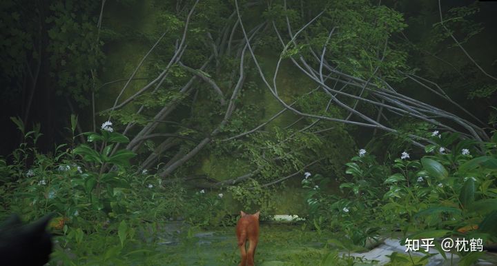 开始游戏正逢风雨交加的雨夜,有时一道闪电点亮洞穴内,再次奠定了游戏的氛围;而与之相对的,是猫咪带来的一种温顺,机敏的生机感,大胆预测主角会为这个压抑的故事带来温暖。
