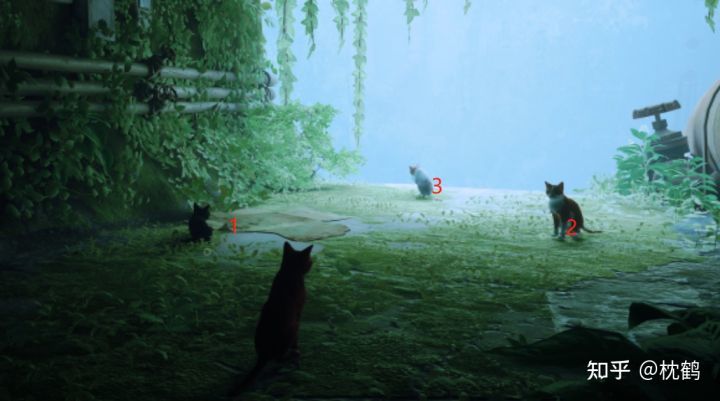 另一方面,三只伙伴AI猫咪的远近关系是有意义的。当所有物体的距离是一致的时候,玩家前往任何方向的动力都是均衡的,因为空间没有对比,任何方向都一样,