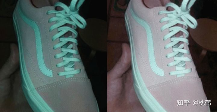 亮度和颜色都是对比出来的,周边亮度暗,那么我们看到的亮部就会感觉更亮。颜色也会受到周边的环境对比出现视误差,常见的例子有这双鞋到底是灰绿还是粉白。