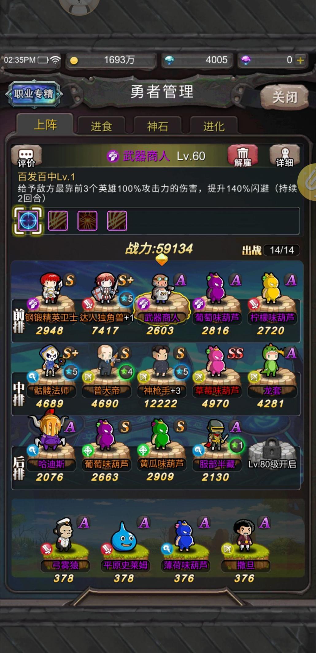 上阵方面,一般前排放战士这种血量高的勇者,没有的话也可以用吸血或者闪避的刺客来作为应急使用。中后排则是法师弓手医生这些输出和辅助勇者。
