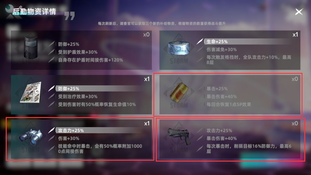 战斗前抽的后勤补给能提高你伤害的上限与下限,推荐各位尽量刷出全输出补给(俗称的三枪、三饮料),打过一次之后就领取足够多的放大器给你重新刷补给。