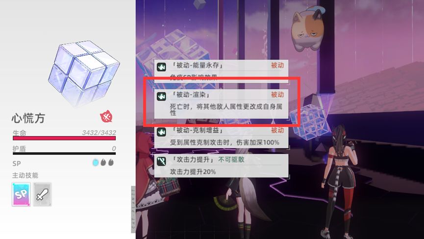 小魔方的被动技能:渲染,会在其死亡时将其他魔方变成与自身相同的属性,也就是打掉蓝属性的魔方之后,其他的魔方都会变成蓝属性。使用全体攻击全灭小魔方时,默认变成第一个小魔方的属性(蓝属性)。