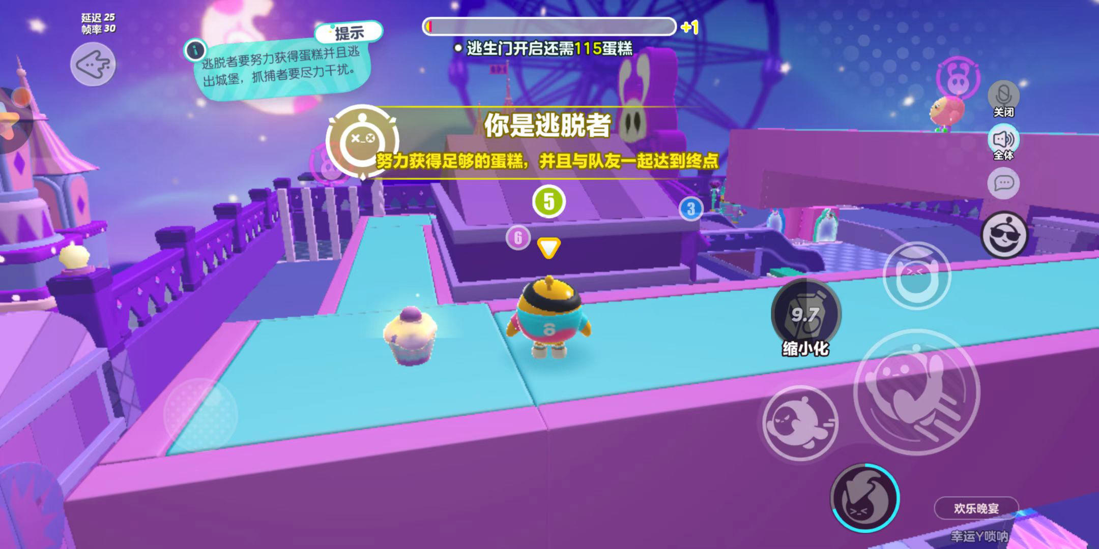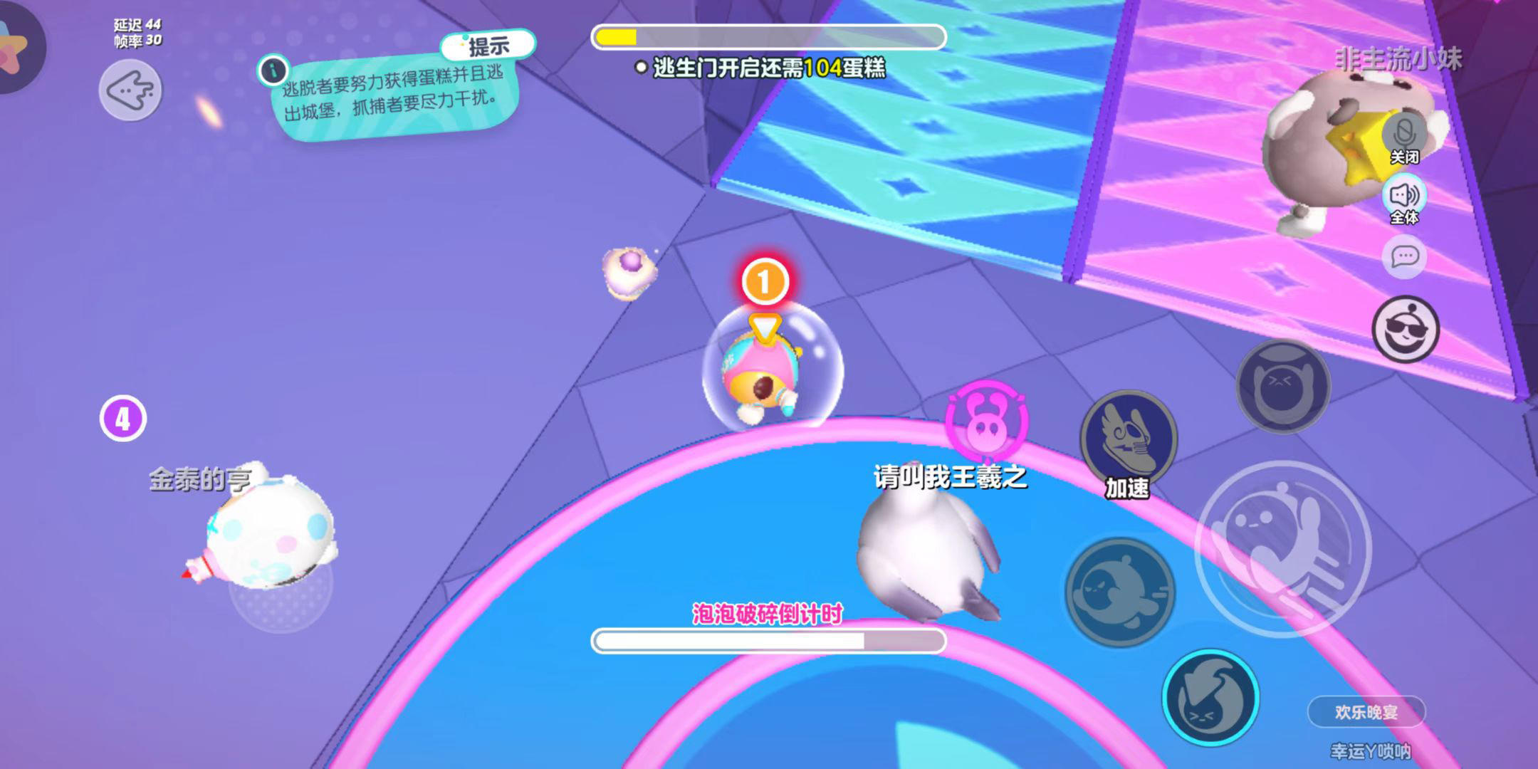 当然,众所周知,要吃到蛋糕还要时刻小心抓捕者的泡泡攻击、干扰机关等等障碍。比如,当屏幕周围弥漫着紫色雾气,逃脱者玩家一定要立刻关注四周,注意不远处正朝向你移动的,标有兔子印记的抓捕者啊!逃脱者不要犹豫,赶紧逃!可以开启最小化、加速技能或利用传送门逃跑。如果被追上了,很可能会被抓捕者的泡泡困住而动弹不得,只能乖乖呆在原地,并且还要失去三个积分。或者可以等待队友的救援,可是如果被困的逃脱者蛋仔没有被救,整个阵营就会失去七个积分。简直亏大了!逃脱者玩家遇到放电桩也要远离,一时的受伤会被抓捕者趁火打劫的呢!