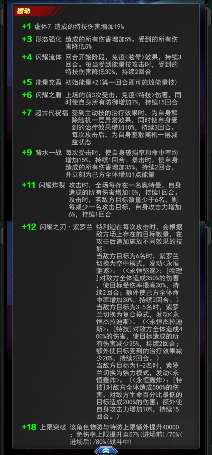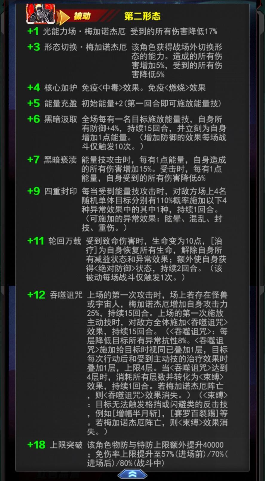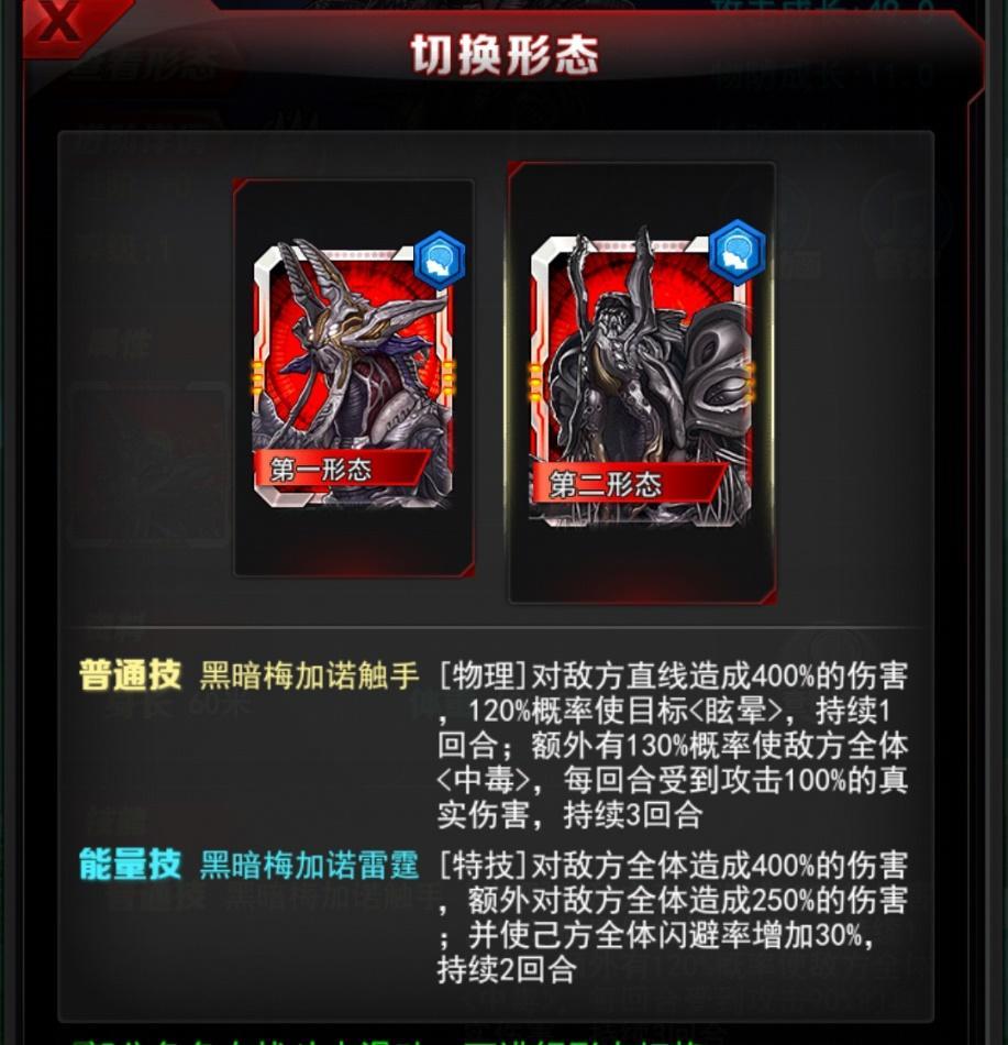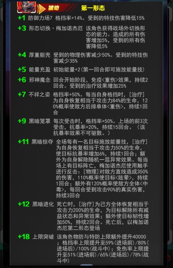 ②能量技:黑暗梅加诺雷霆 [特技]对敌方全体造成400%的伤害,额外对敌方全体造成250%的伤害;并使己方全体闪避率增加30%,持续2回合。